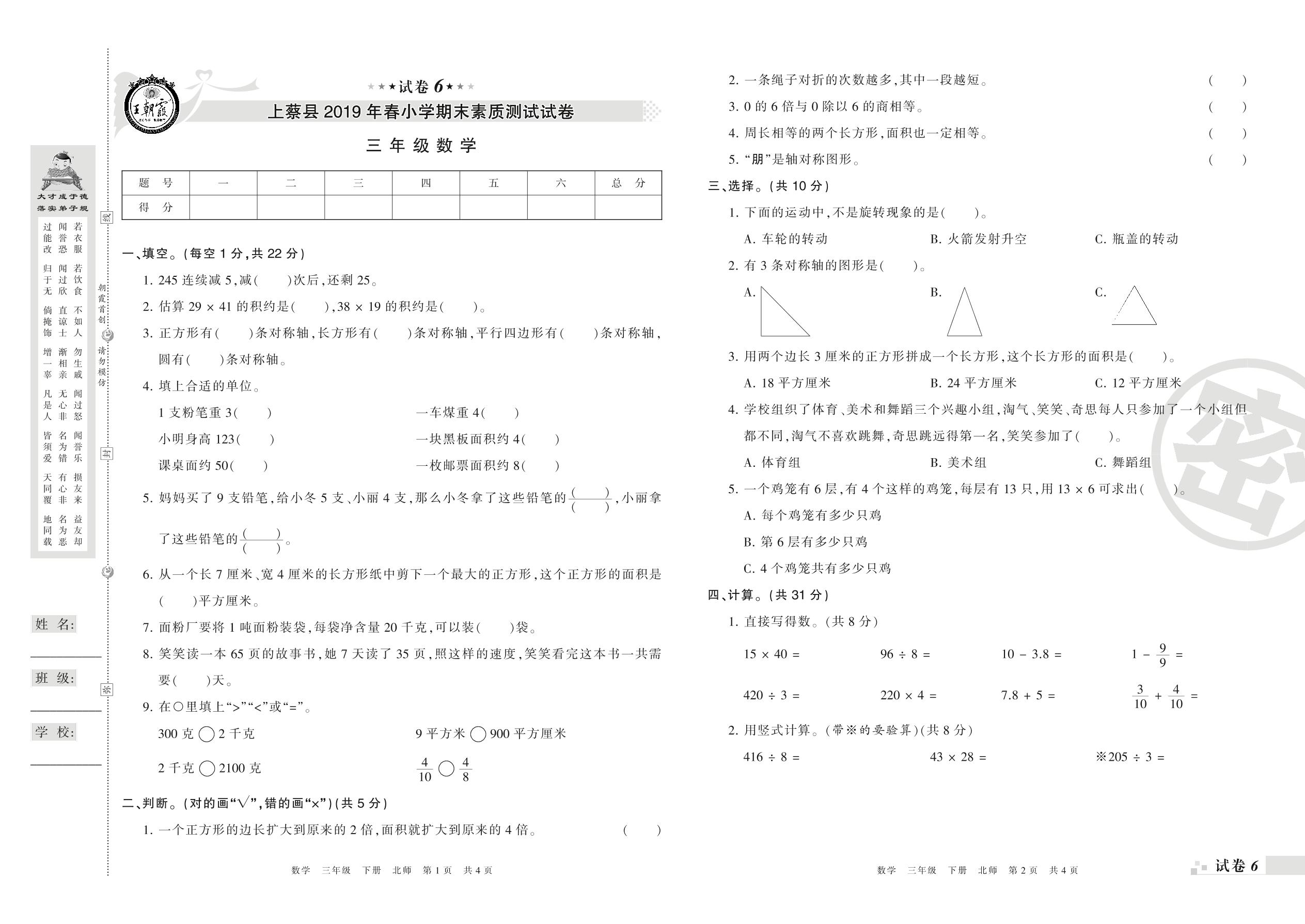 2018-2019学年第二学期驻马店市上蔡县三年级数学试卷(北师版)【6】