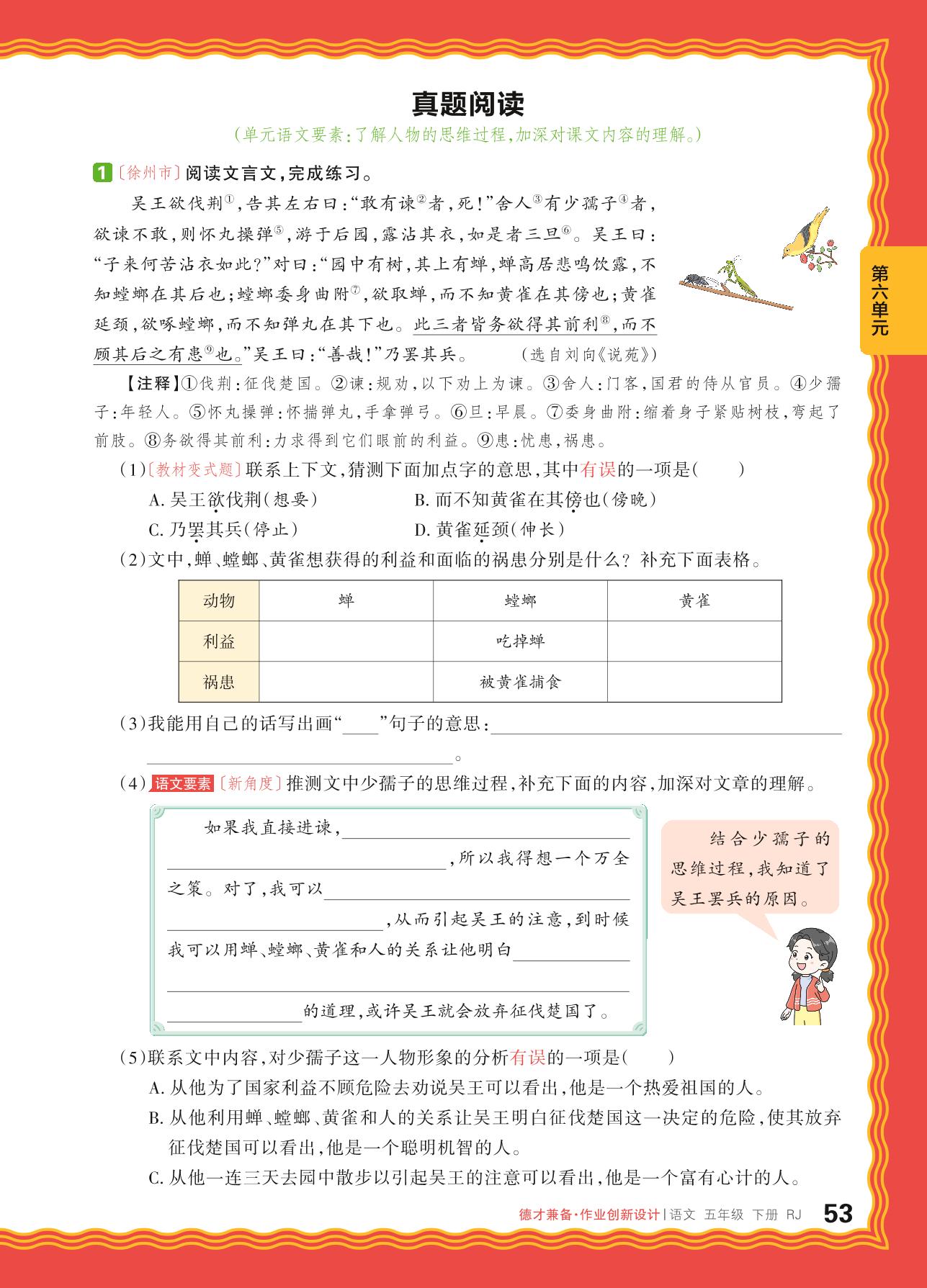 2024春下册五年级语文人教版 第六单元 思维的火花——真题阅读