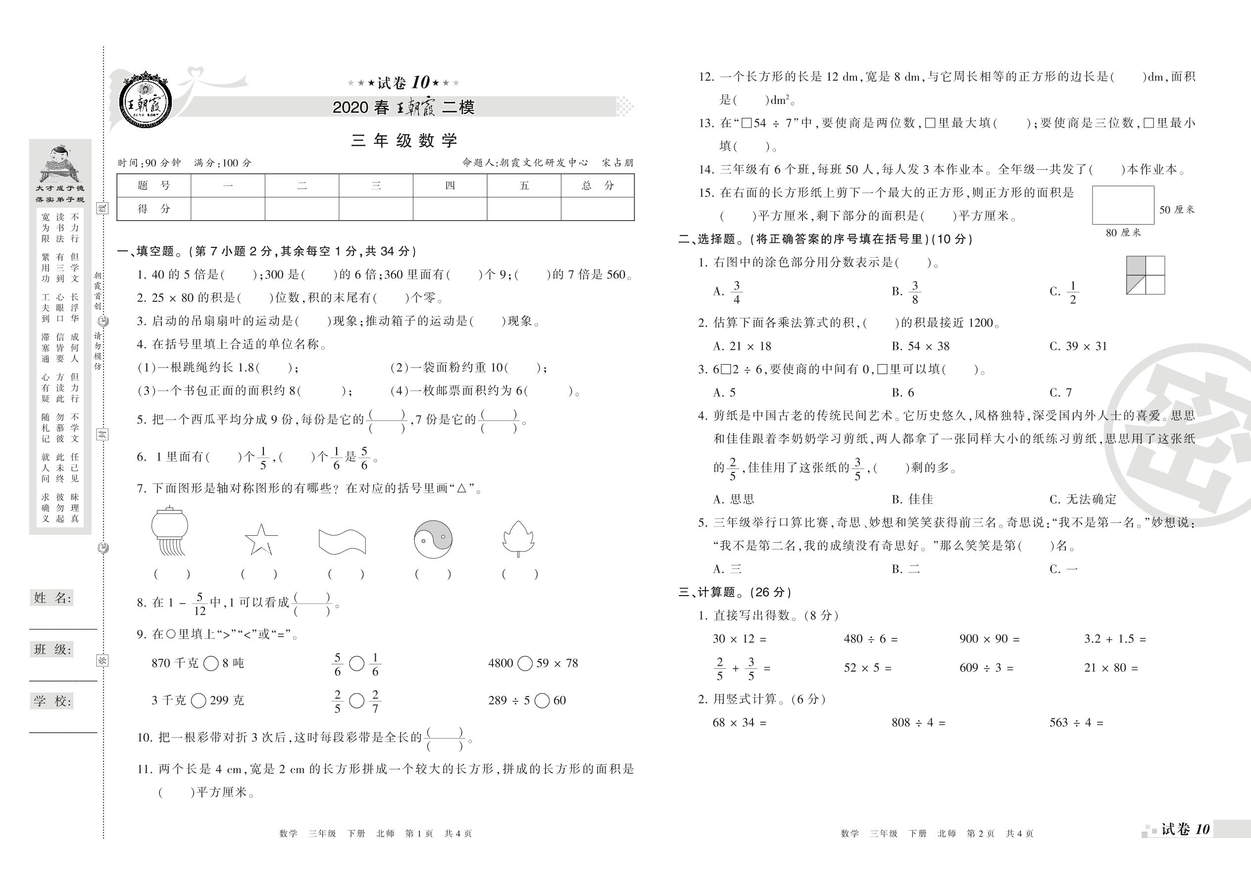 王朝霞期末模拟卷三年级下册数学(北师版)_R21080494549【10】
