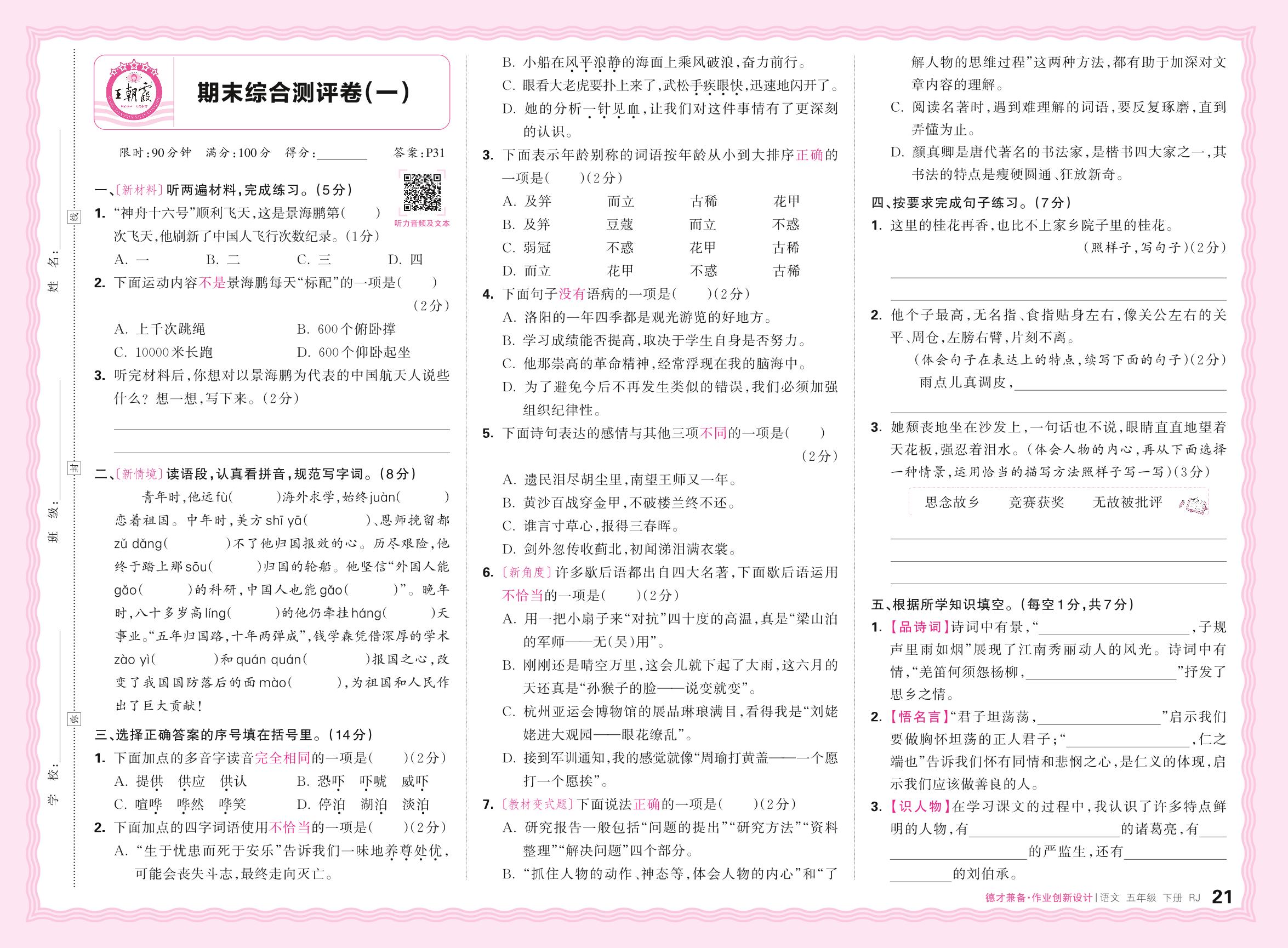 五年级语文人教版下册期末卷