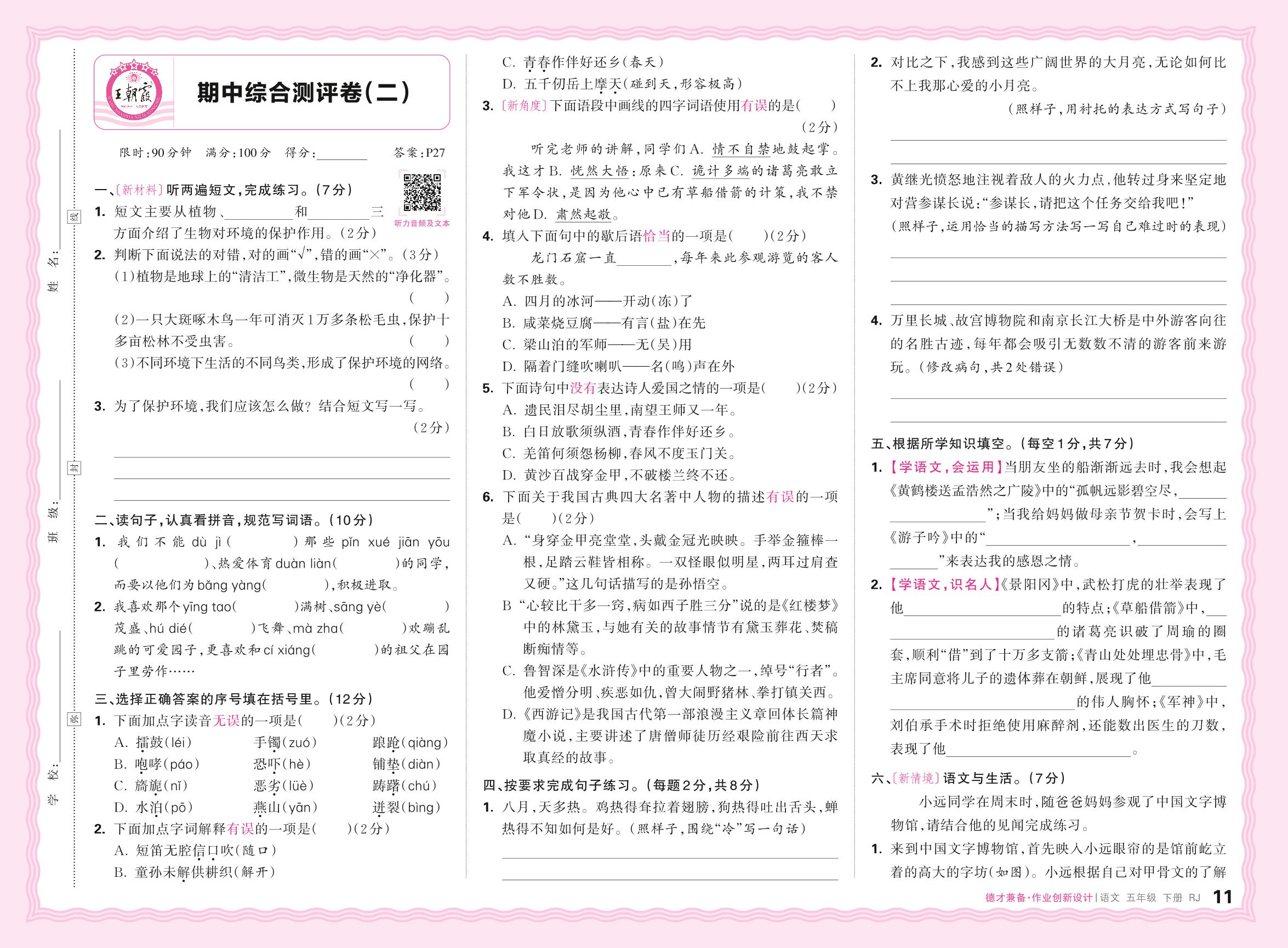 2024春下册五年级语文人教版 期中综合测评卷(二)