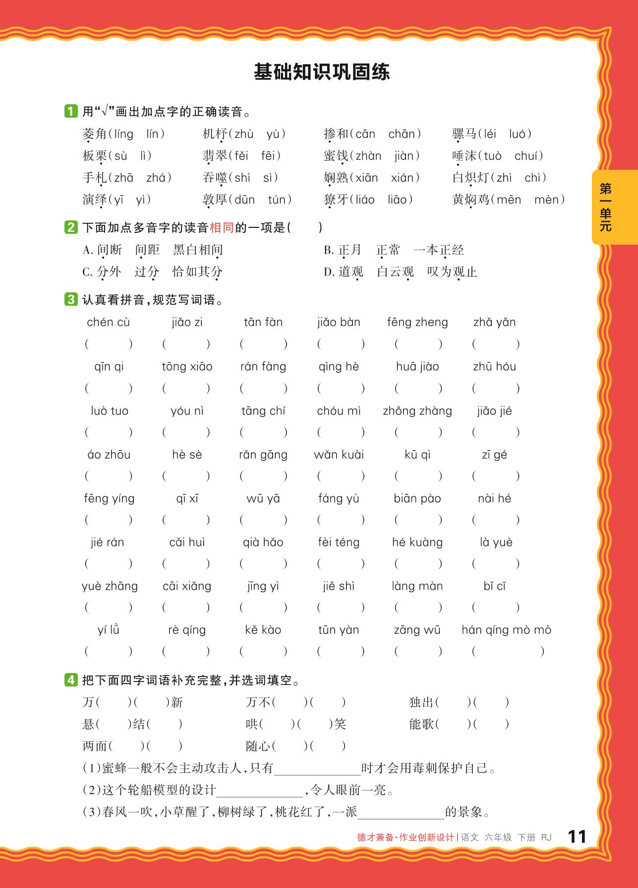 2024春下册六年级语文人教版 第一单元 民风民俗——基础知识巩固练