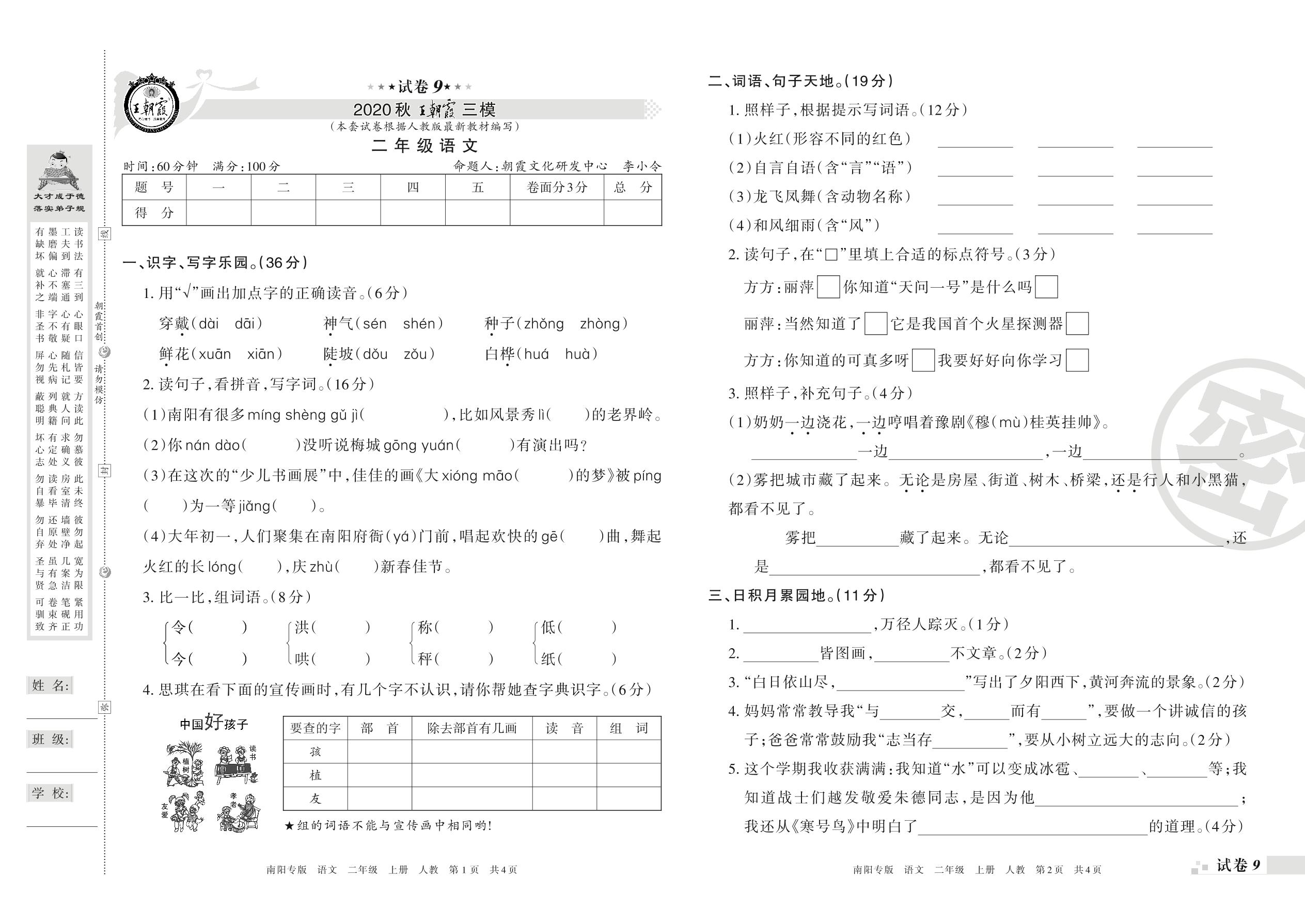 王朝霞期末模拟卷二年级上册语文(人教版)_R21080164346【9】