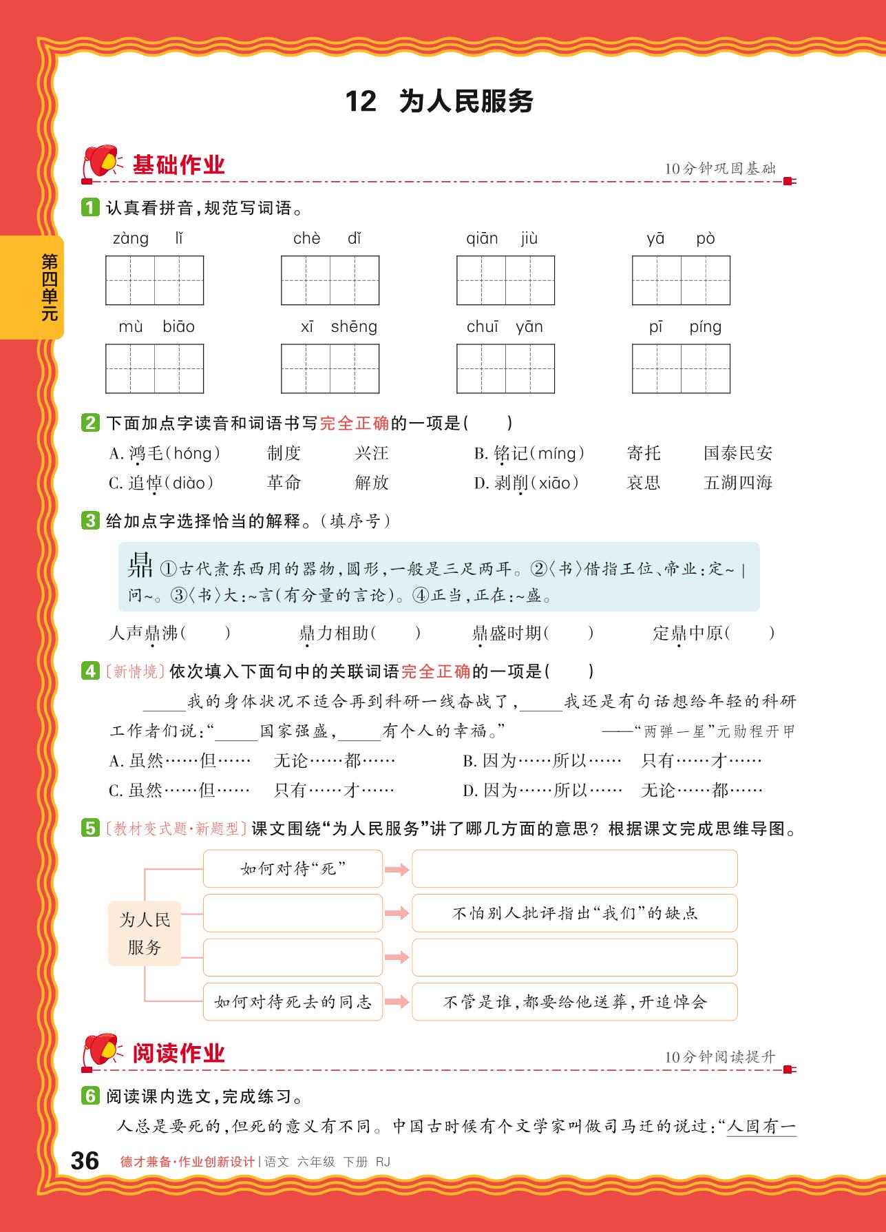2024春下册六年级语文人教版 第四单元 理想和信念——12. 为人民服务_R240117145134226