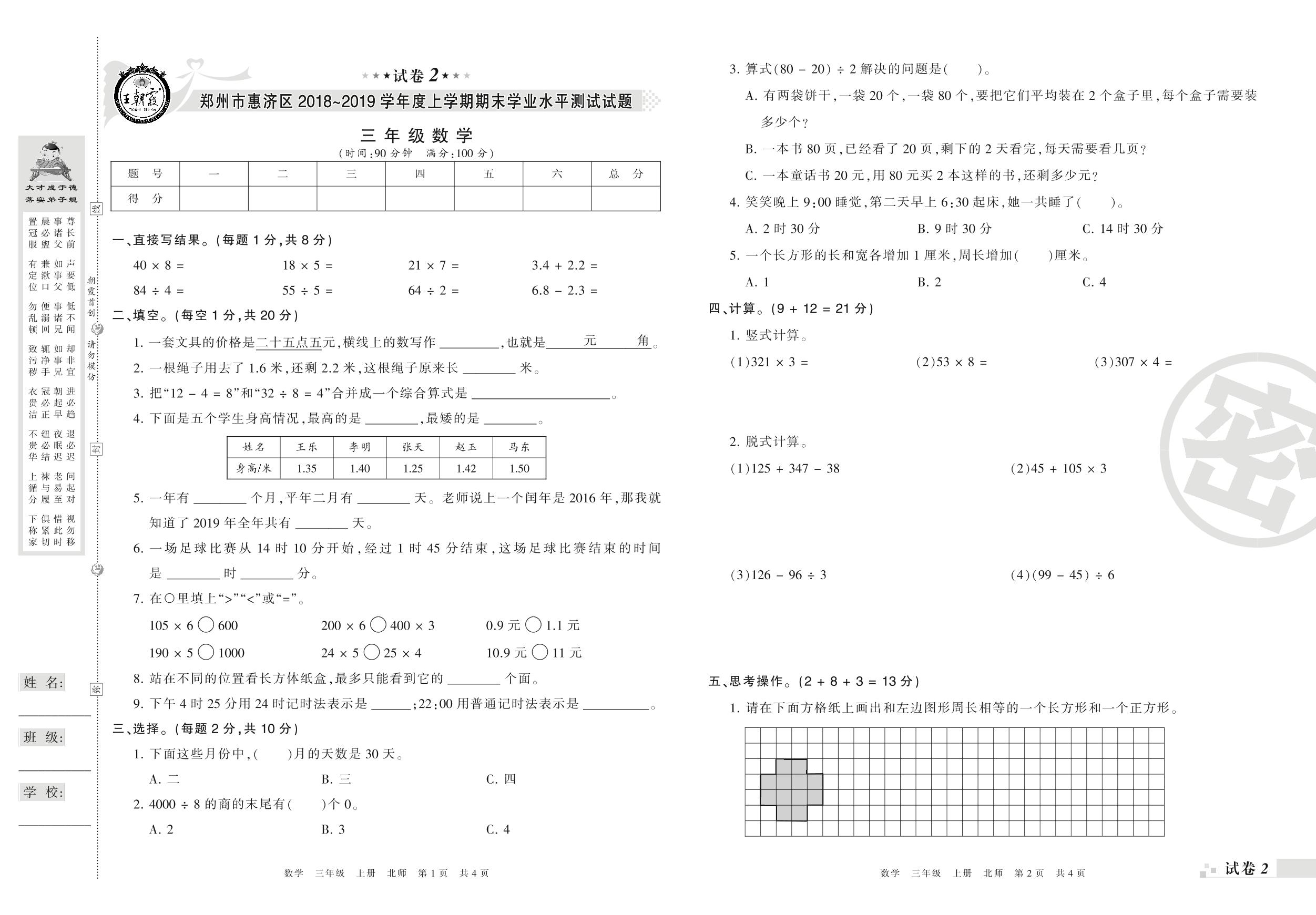 2018-2019学年第一学期郑州市惠济区三年级数学试卷(北师版)【2】
