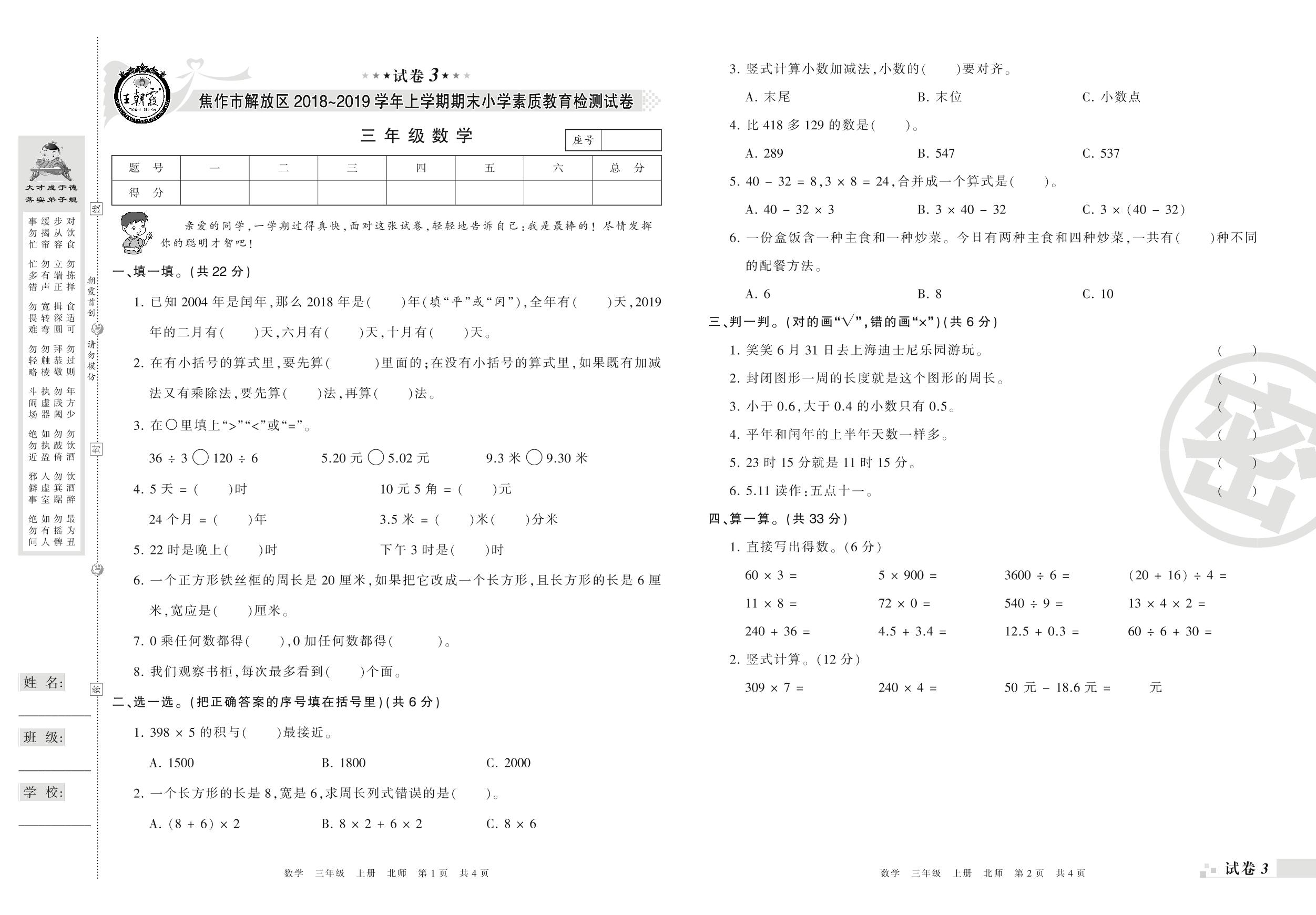 2018-2019学年第一学期焦作市解放区三年级数学试卷(北师版)【3】