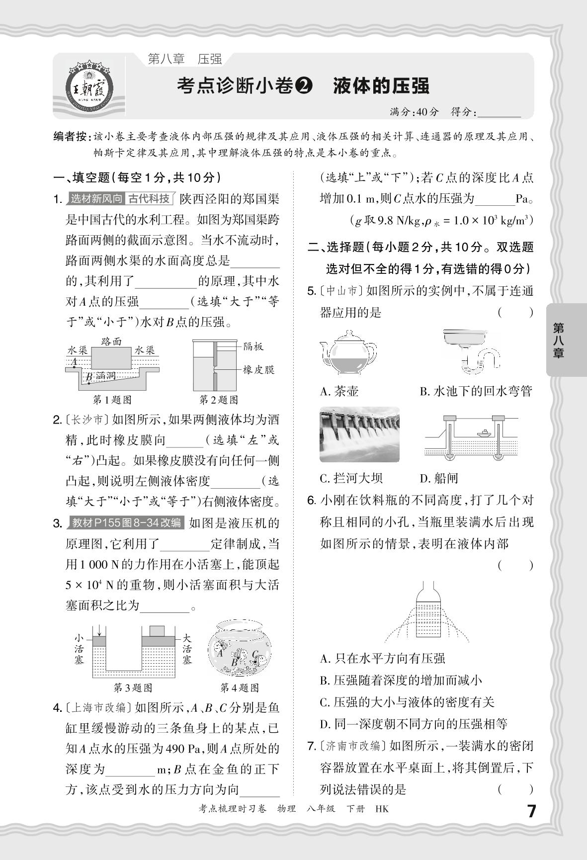 2024春下册八年级物理沪科版 第八章 考点诊断小卷2 液体的压强