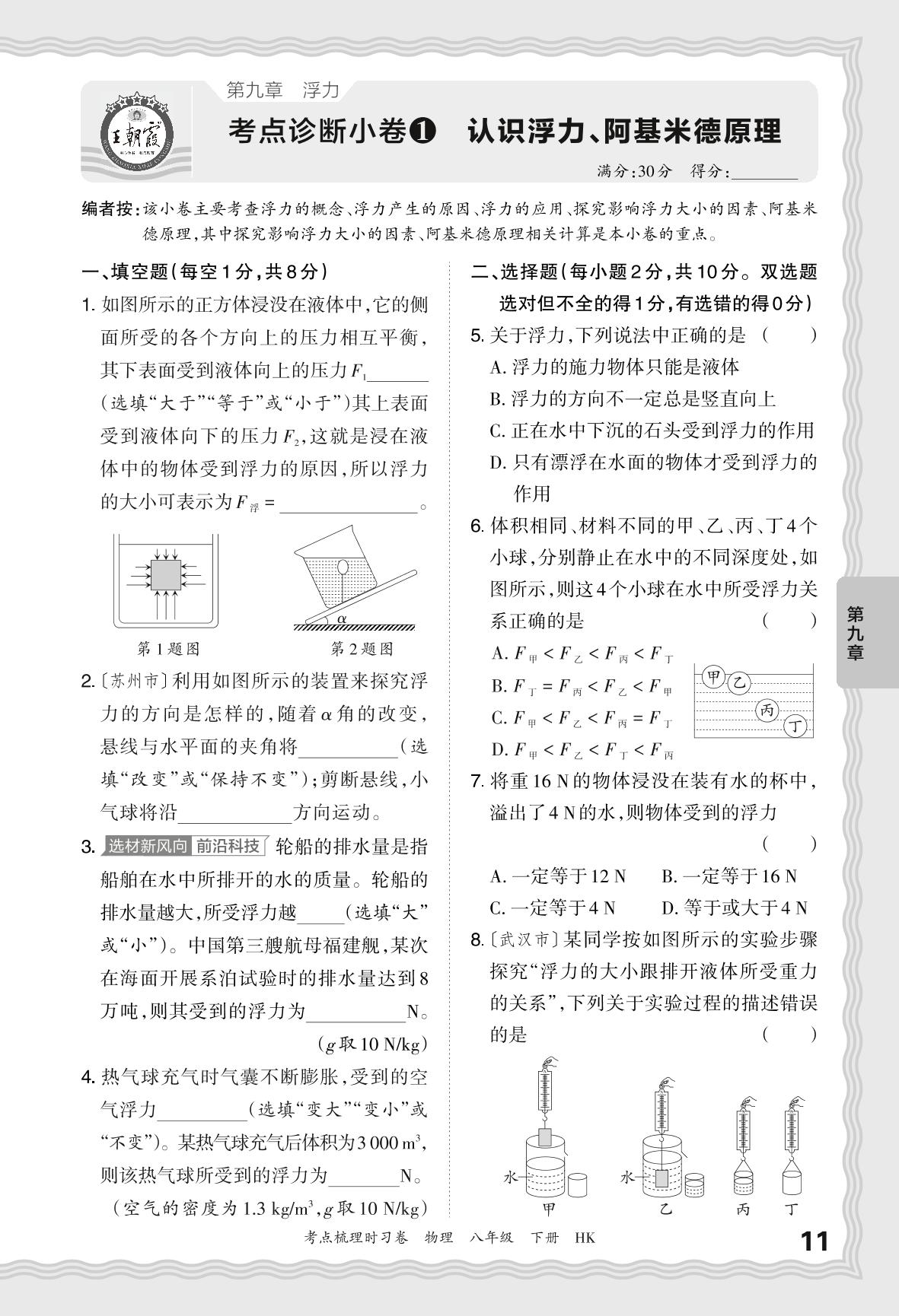 2024春下册八年级物理沪科版 第九章 考点诊断小卷1 认识浮力、阿基米德原理