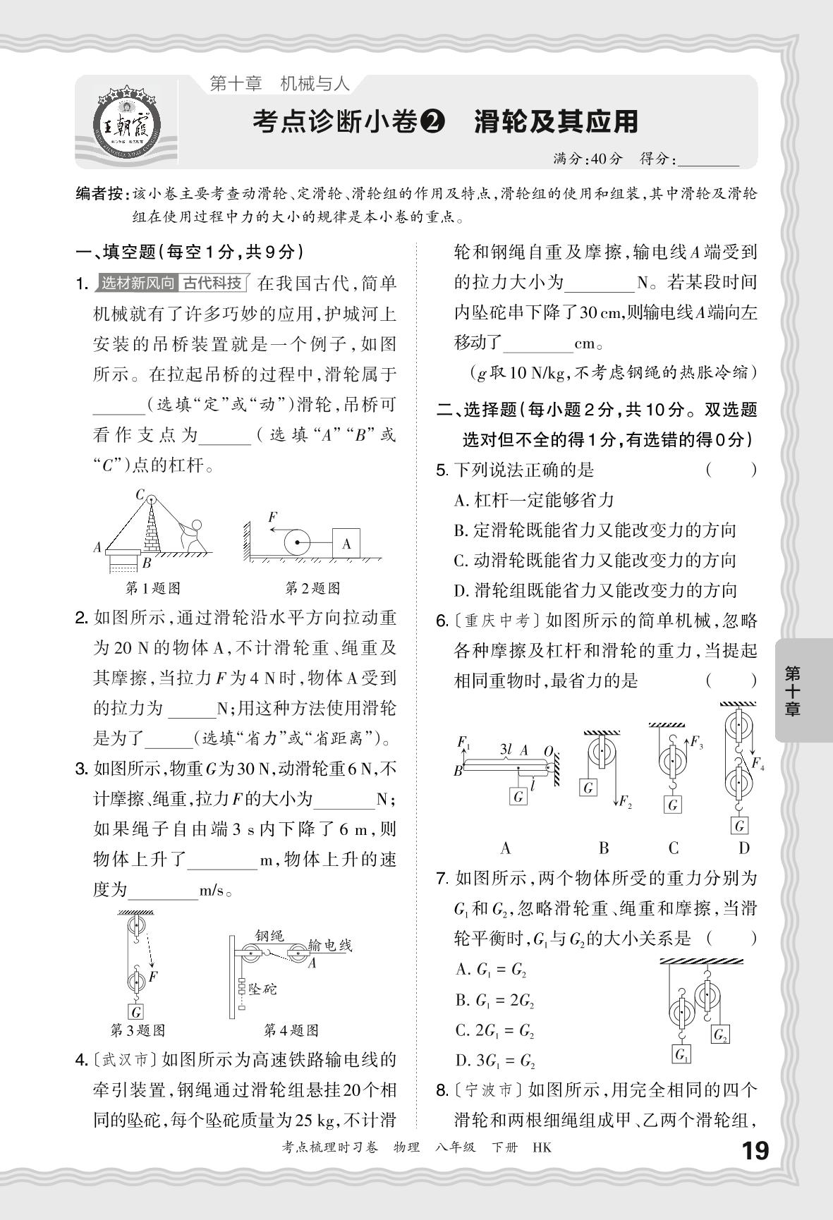 2024春下册八年级物理沪科版 第十章 考点诊断小卷2 滑轮及其应用