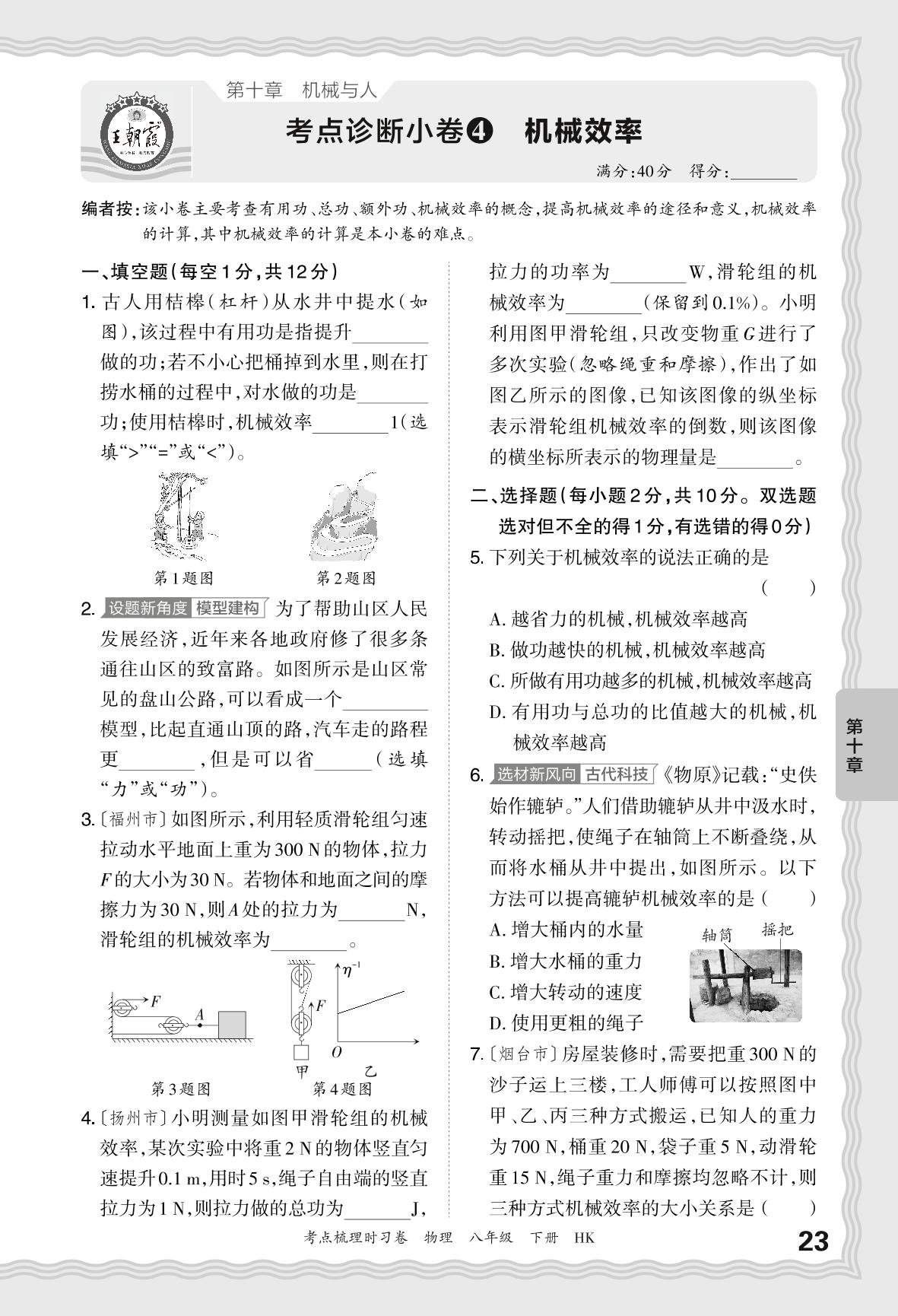 2024春下册八年级物理沪科版 第十章 考点诊断小卷4 机械效率