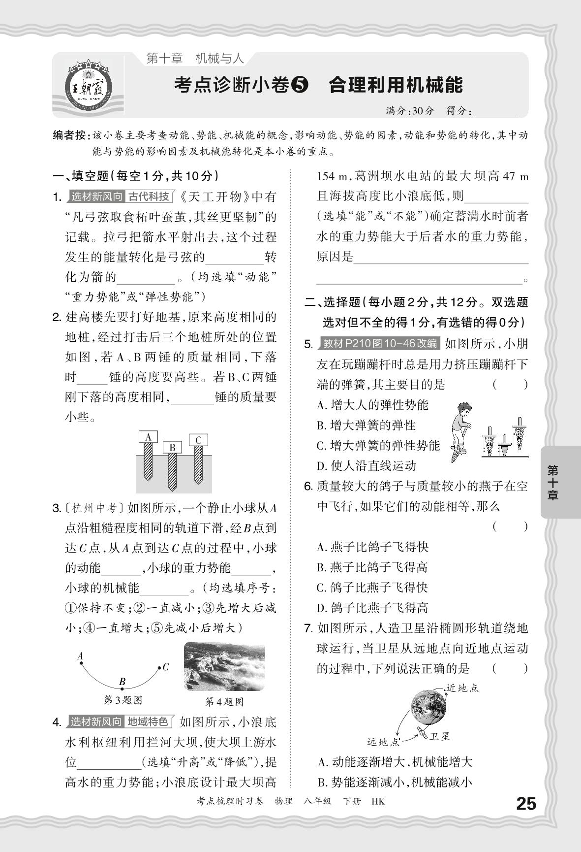 2024春下册八年级物理沪科版 第十章 考点诊断小卷5 合理利用机械能