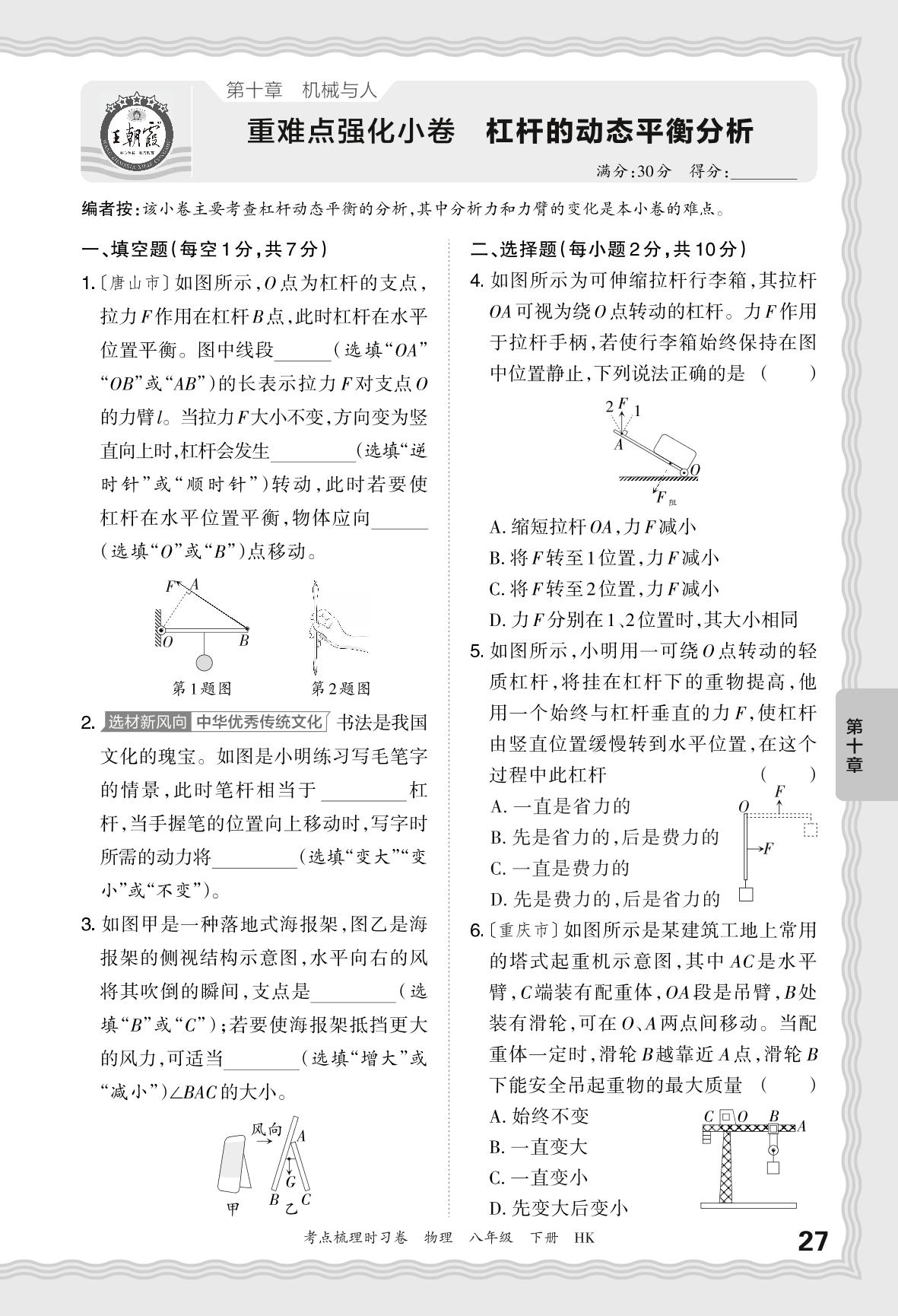 2024春下册八年级物理沪科版 第十章 重难点强化小卷 杠杆的动态平衡分析