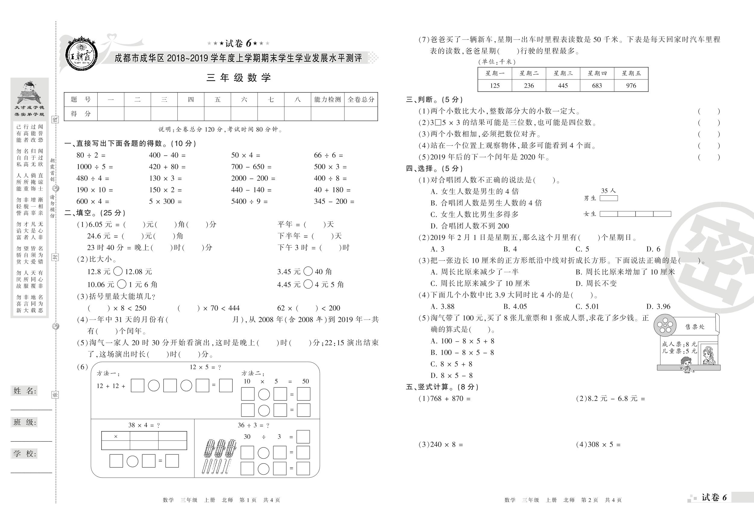 2018-2019学年第一学期成都市成华区三年级数学试卷(北师版)【6】
