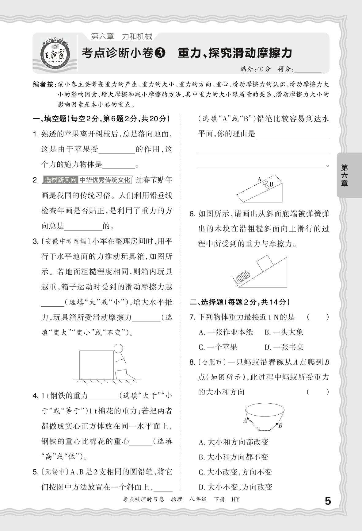 2024春下册八年级物理沪粤版 第六章 考点诊断小卷3 重力、探究滑动摩擦力