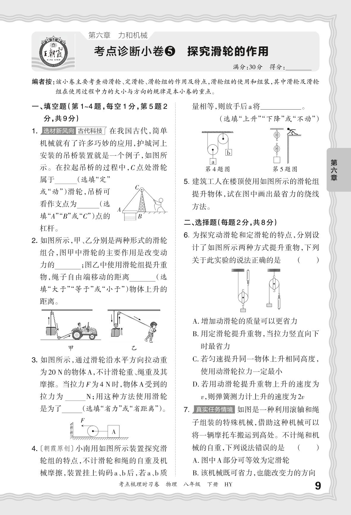 2024春下册八年级物理沪粤版 第六章 考点诊断小卷5 探究滑轮的作用
