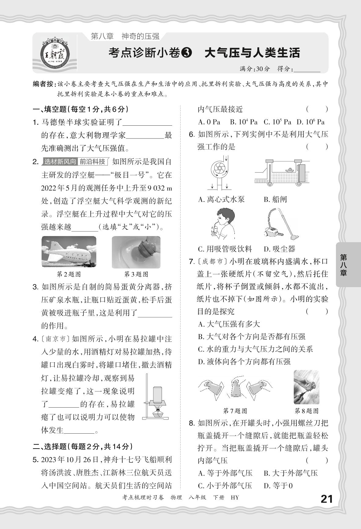 2024春下册八年级物理沪粤版 第八章 考点诊断小卷3 大气压与人类生活