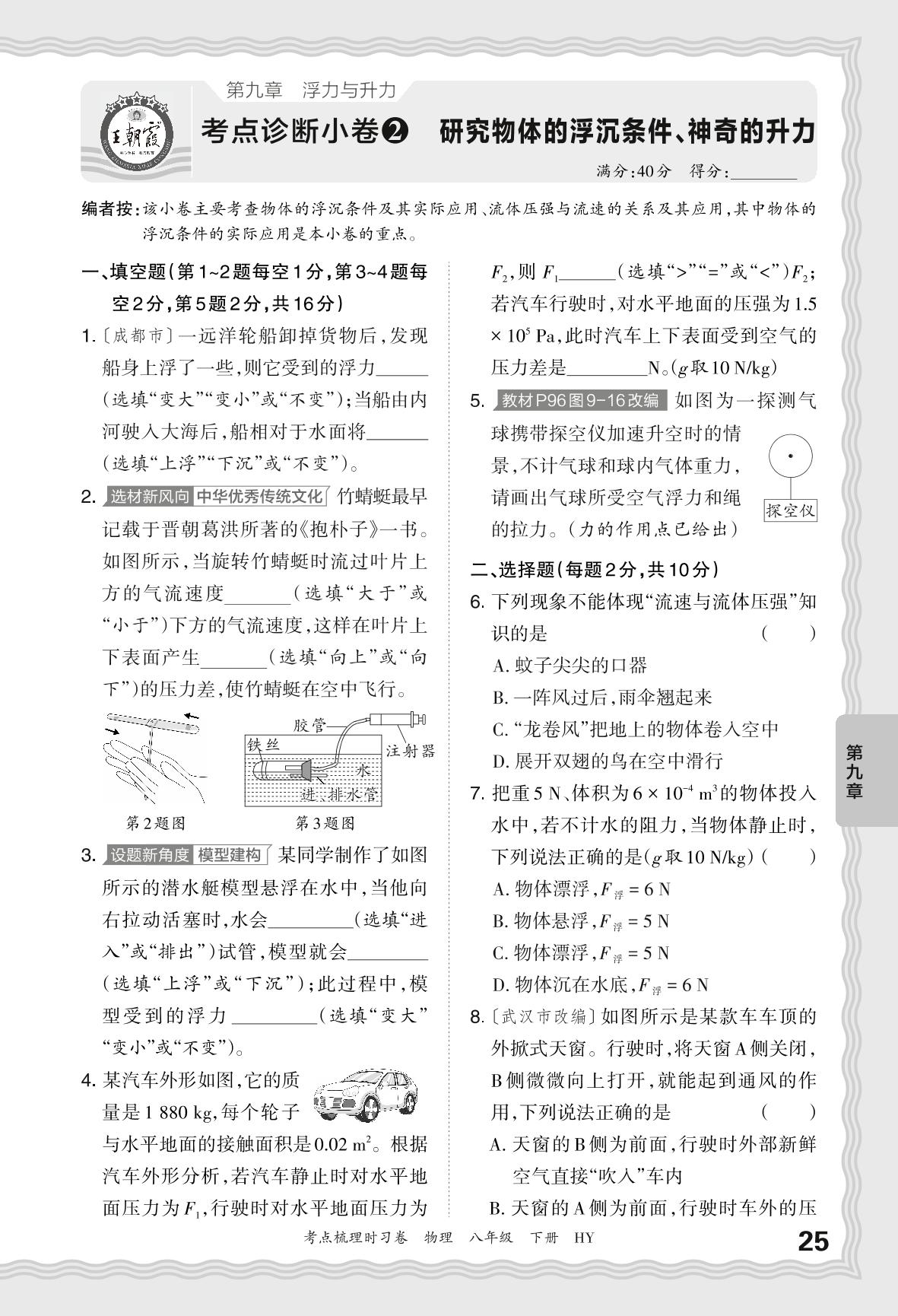 2024春下册八年级物理沪粤版 第九章 考点诊断小卷2 研究物体的浮沉条件、神奇的升力