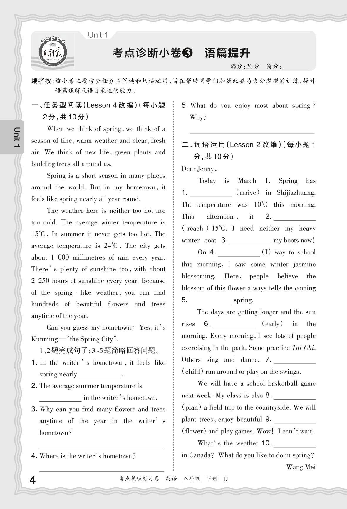2024春下册八年级英语冀教版 Unit 1 考点诊断小卷3 语篇提升