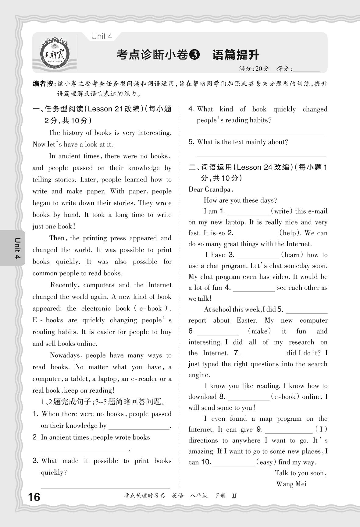 2024春下册八年级英语冀教版 Unit 4 考点诊断小卷3 语篇提升