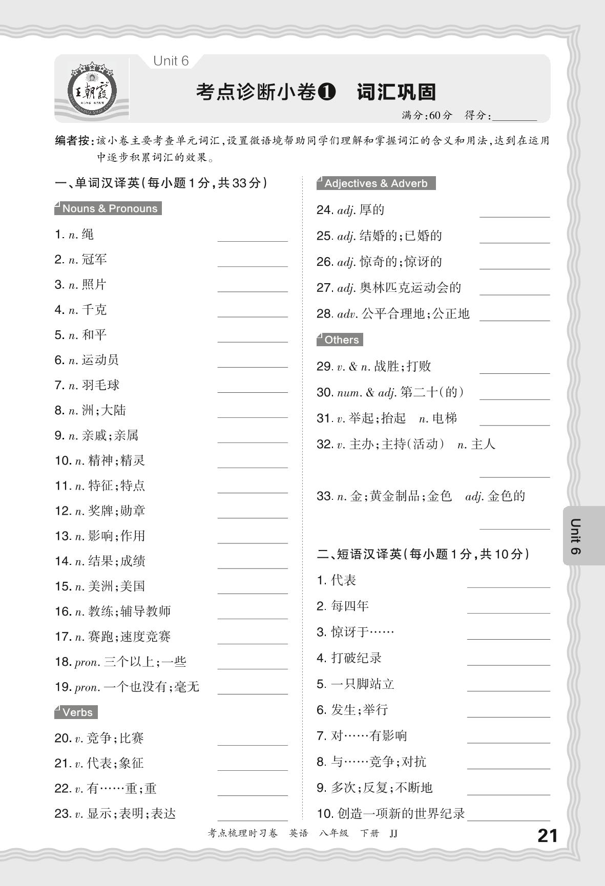 2024春下册八年级英语冀教版 Unit 6 考点诊断小卷1 词汇巩固