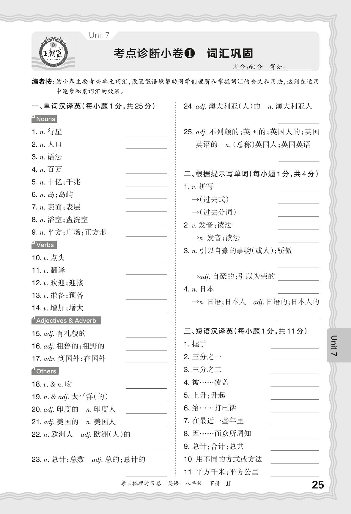 2024春下册八年级英语冀教版 Unit 7 考点诊断小卷1 词汇巩固