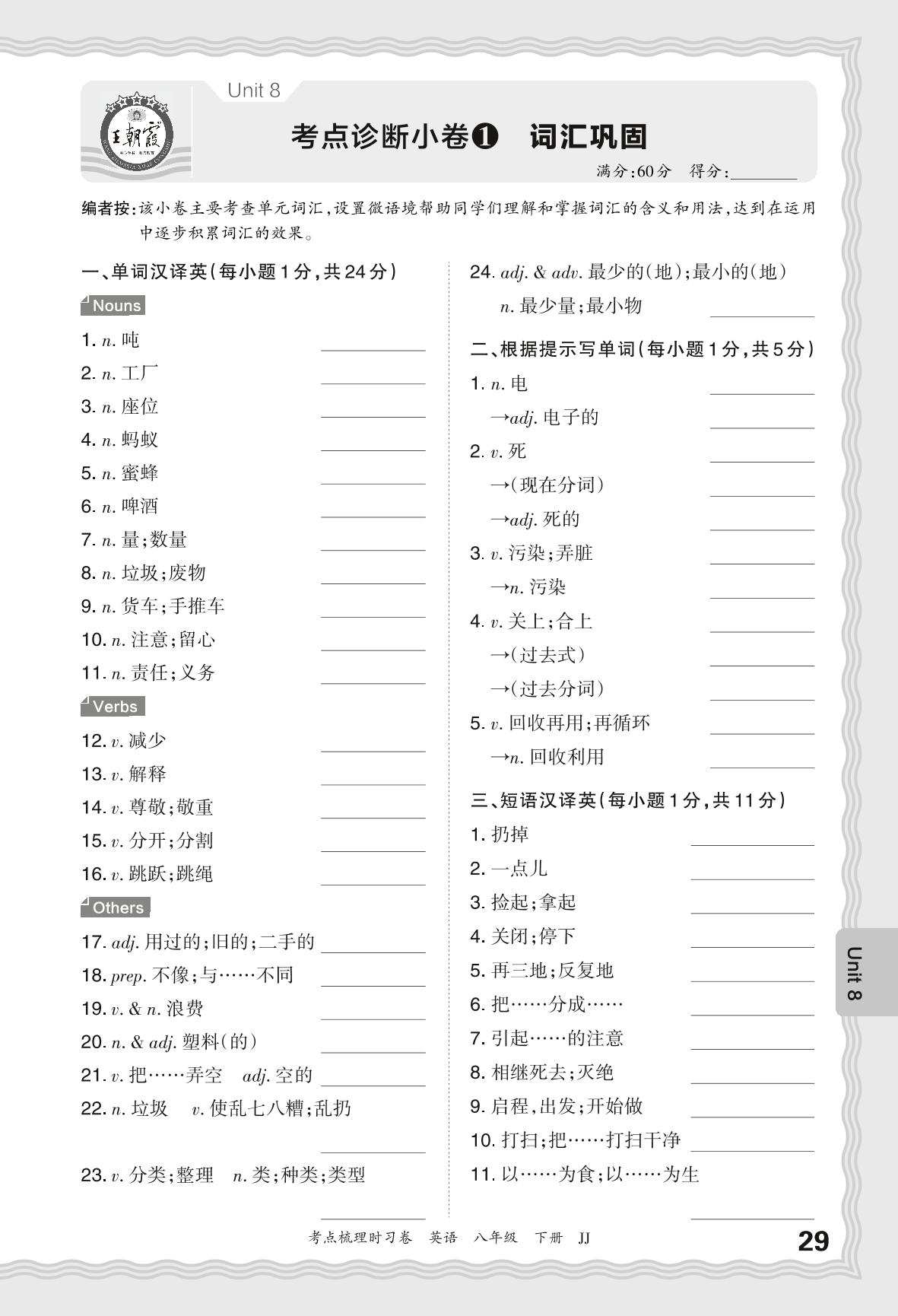 2024春下册八年级英语冀教版 Unit 8 考点诊断小卷1 词汇巩固