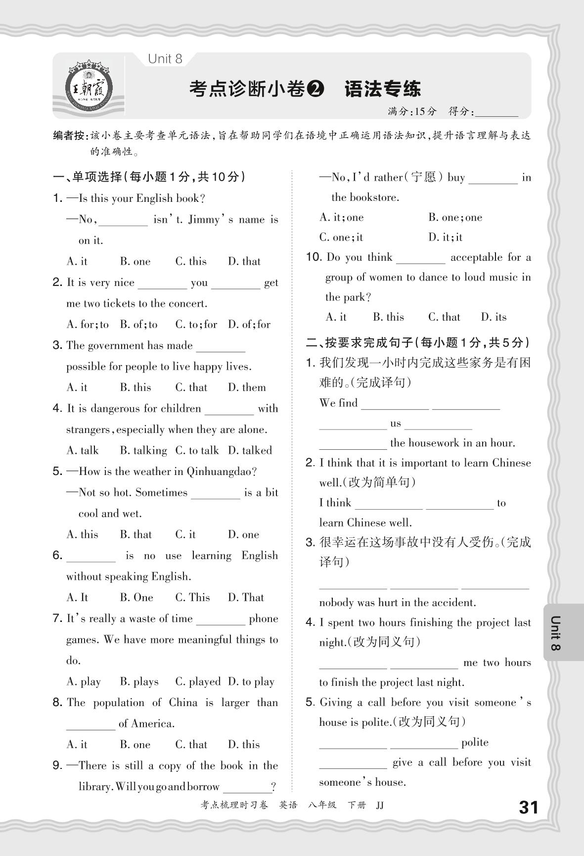 2024春下册八年级英语冀教版 Unit 8 考点诊断小卷2 语法专练