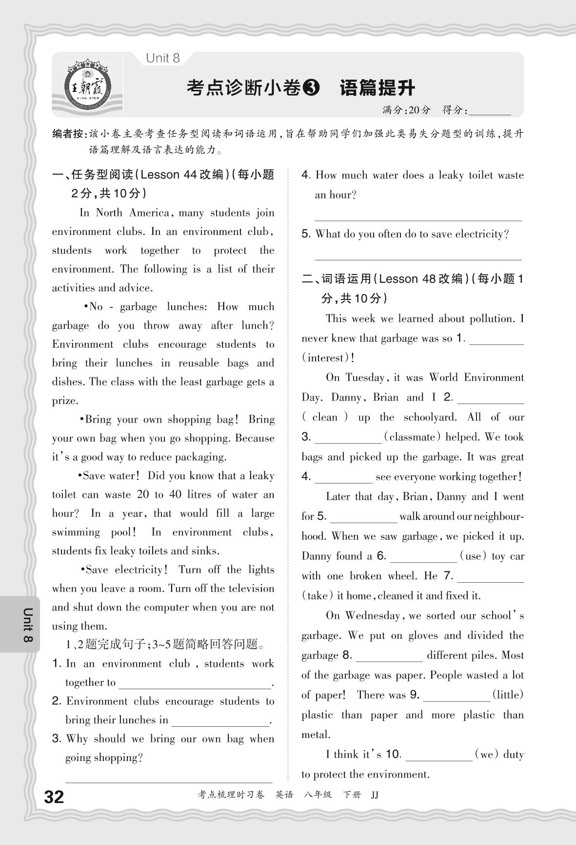 2024春下册八年级英语冀教版 Unit 8 考点诊断小卷3 语篇提升