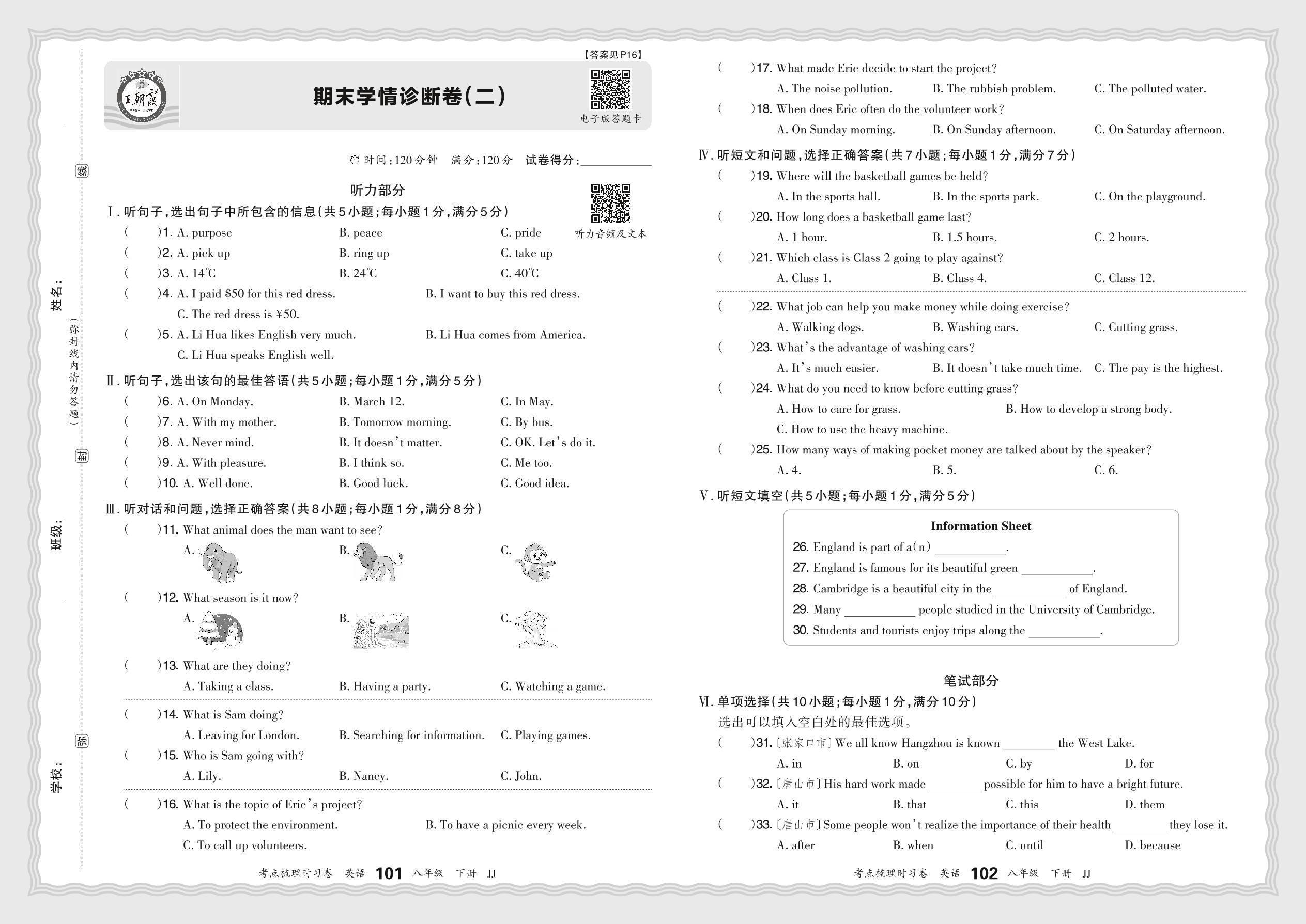2024春下册八年级英语冀教版 期末学情诊断卷(二)