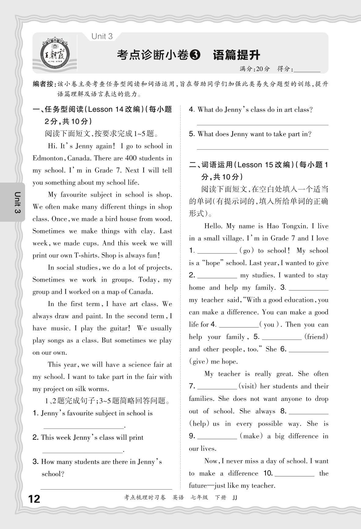 2024春下册七年级英语冀教版 Unit 3 考点诊断小卷3 语篇提升