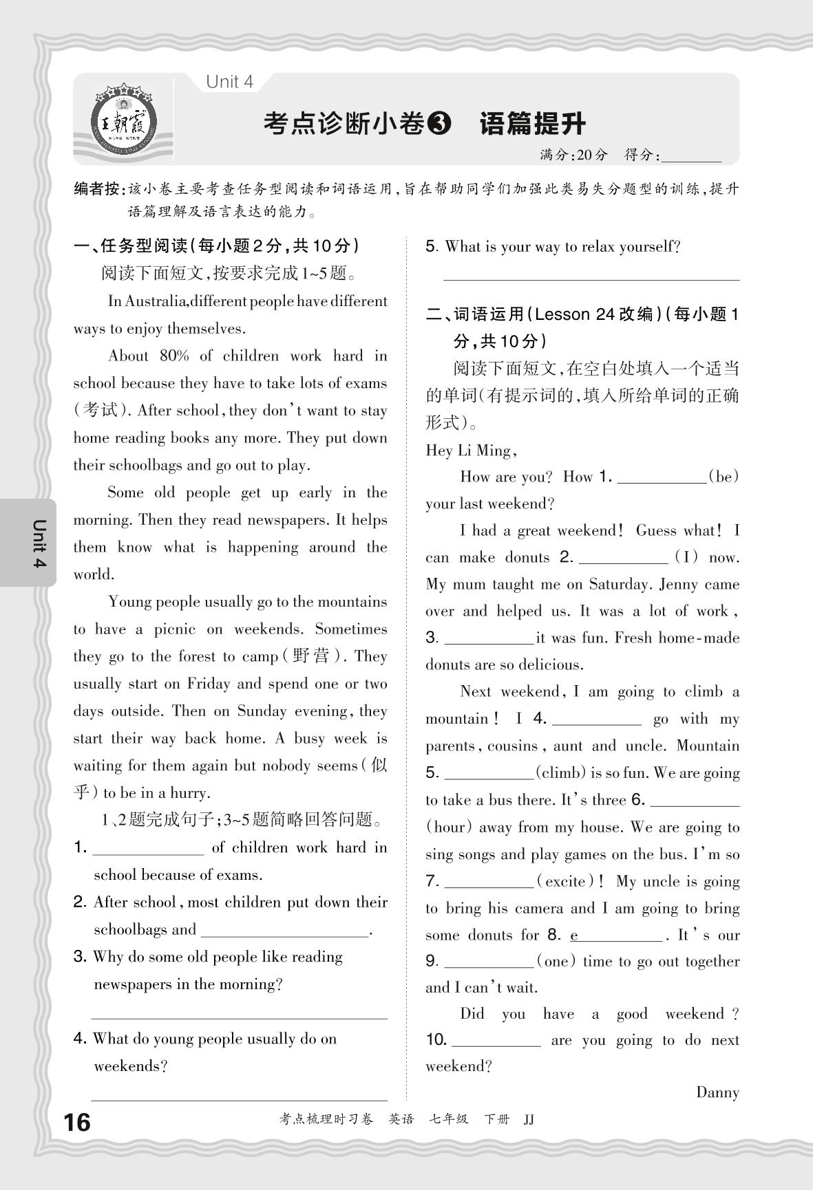 2024春下册七年级英语冀教版 Unit 4 考点诊断小卷3 语篇提升