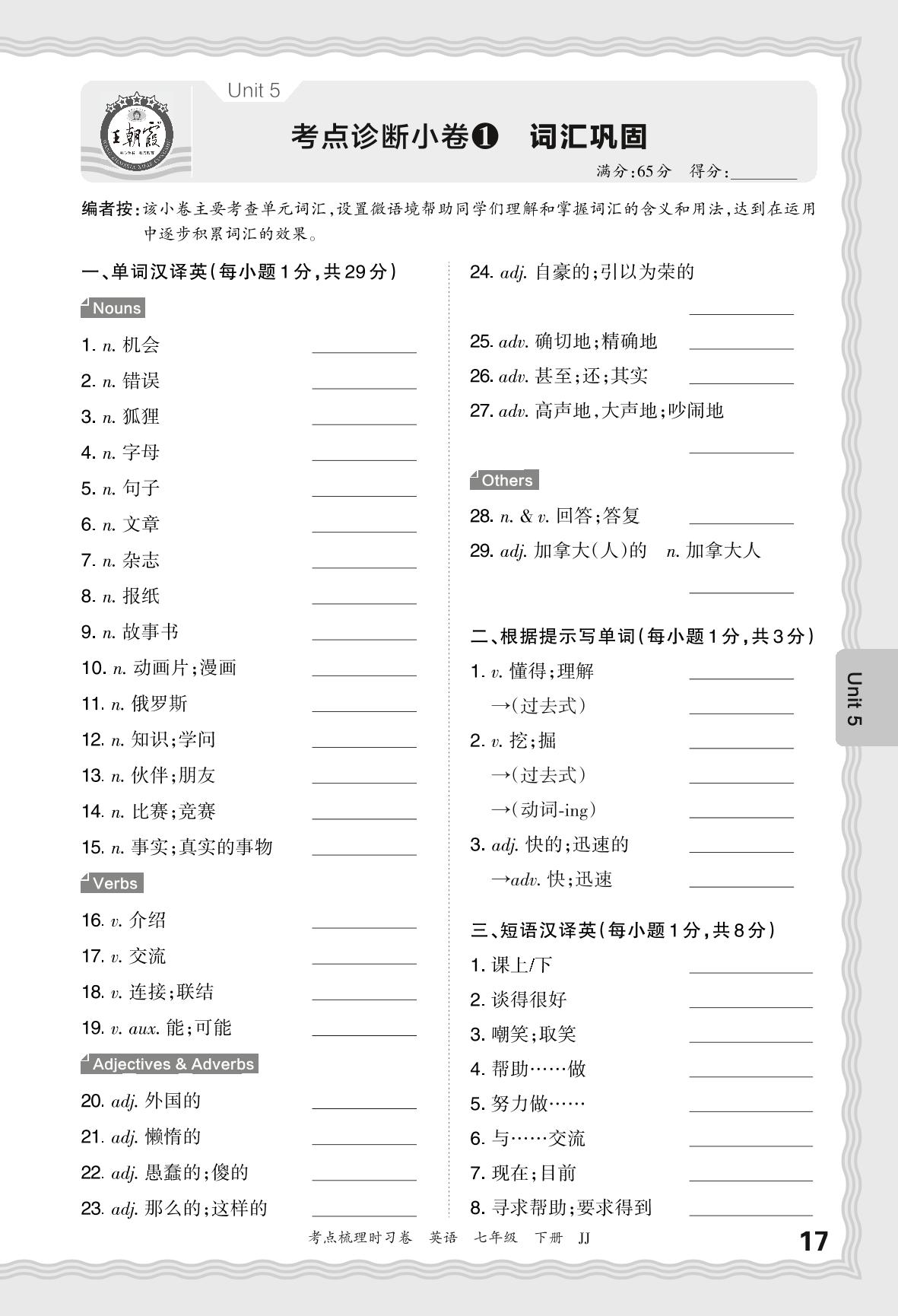 2024春下册七年级英语冀教版 Unit 5 考点诊断小卷1 词汇巩固