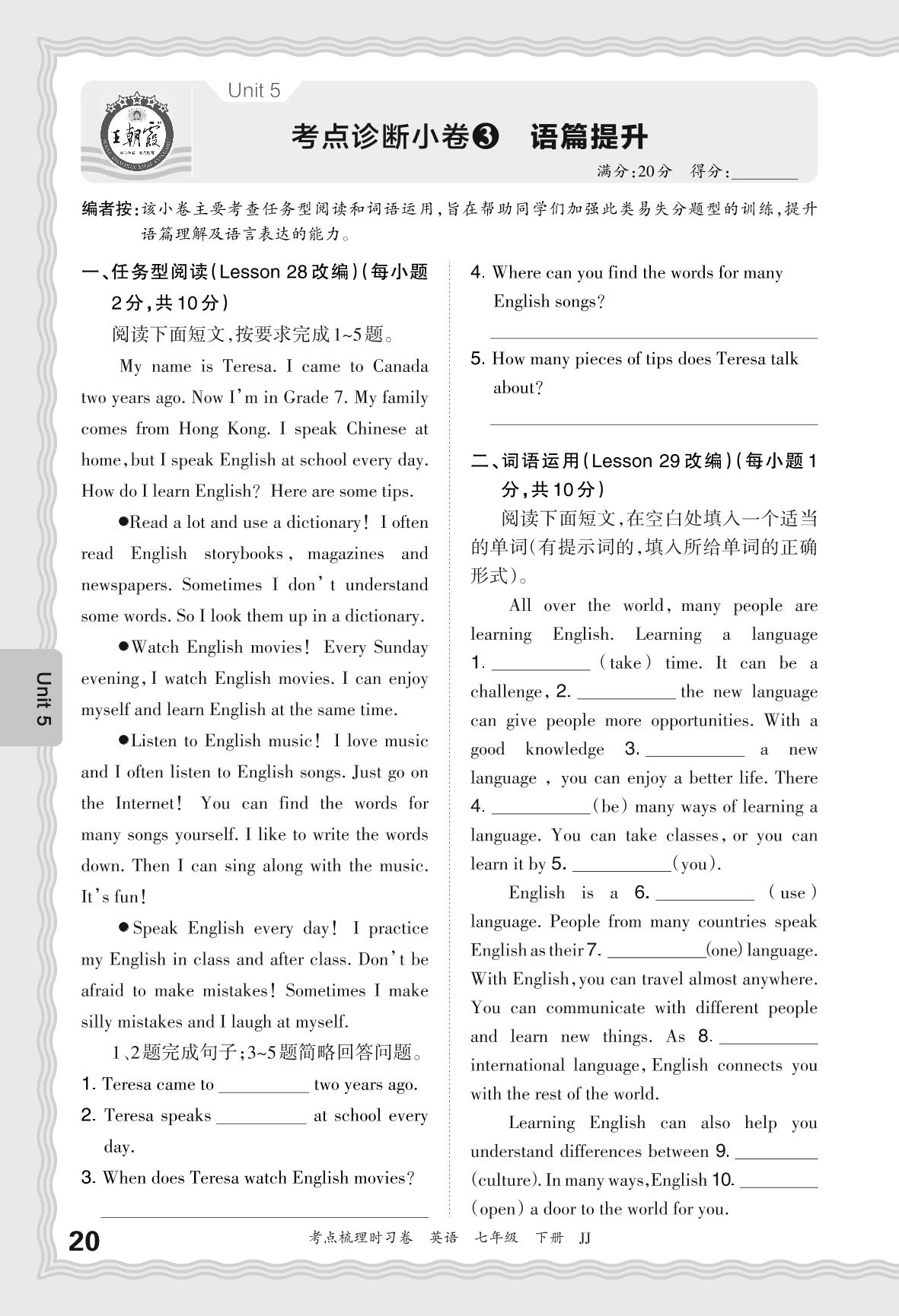 2024春下册七年级英语冀教版 Unit 5 考点诊断小卷3 语篇提升