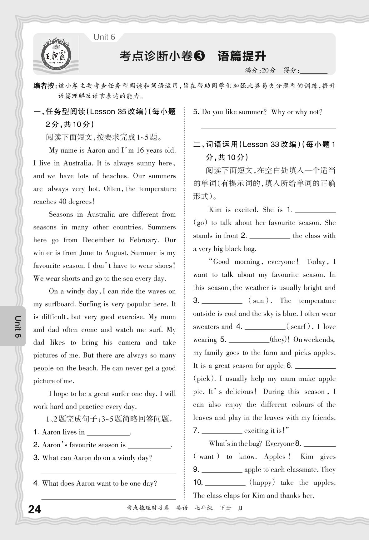 2024春下册七年级英语冀教版 Unit 6 考点诊断小卷3 语篇提升