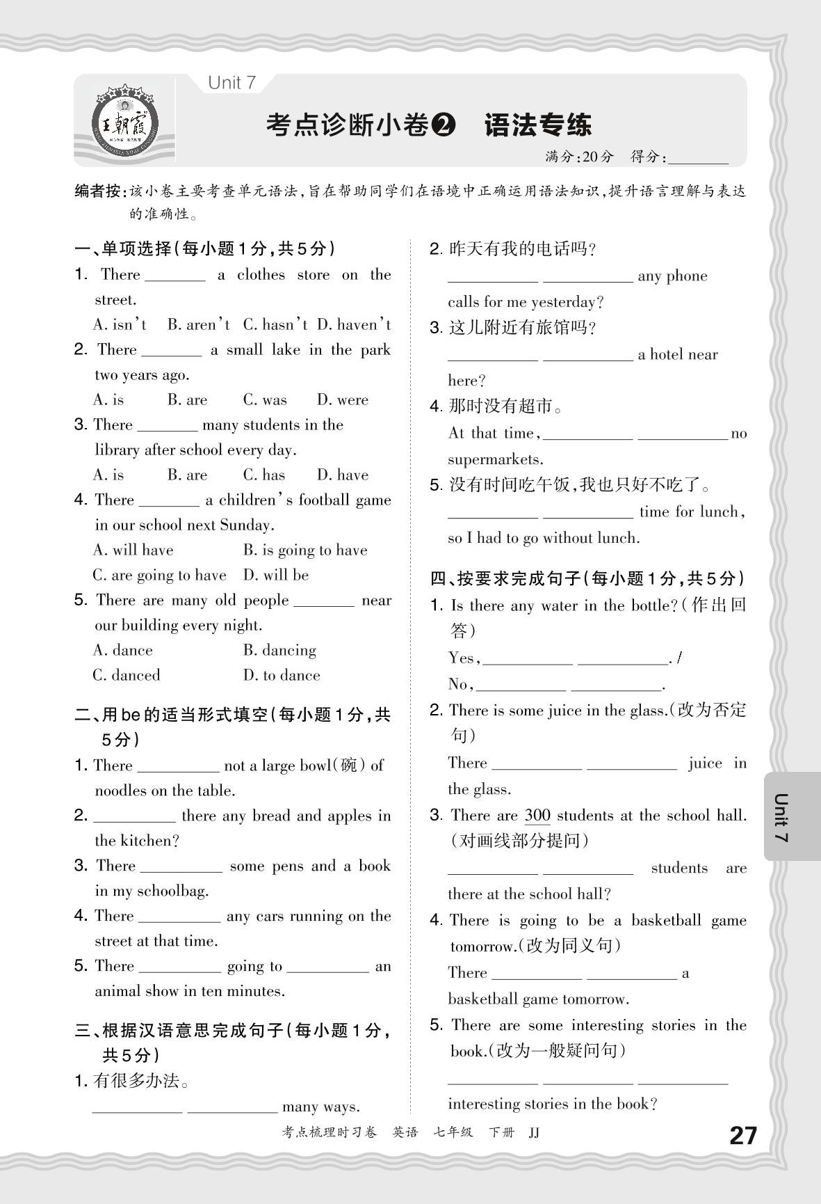 2024春下册七年级英语冀教版 Unit 7 考点诊断小卷2 语法专练