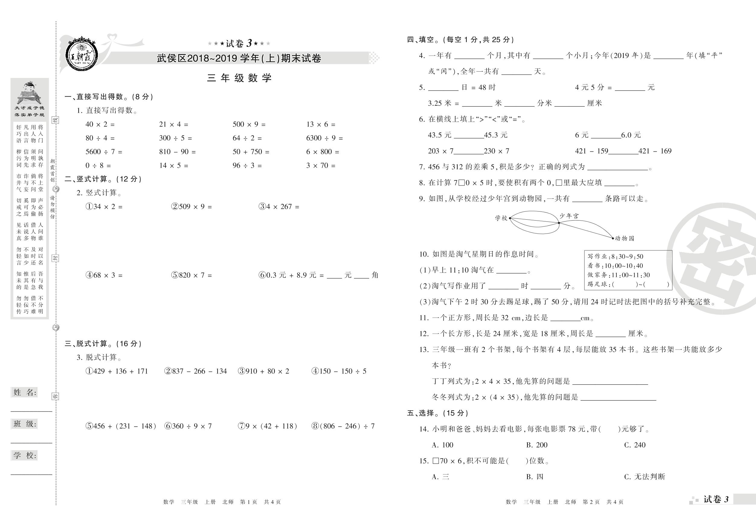 2018-2019学年第一学期成都市武侯区三年级数学试卷(北师版)【3】