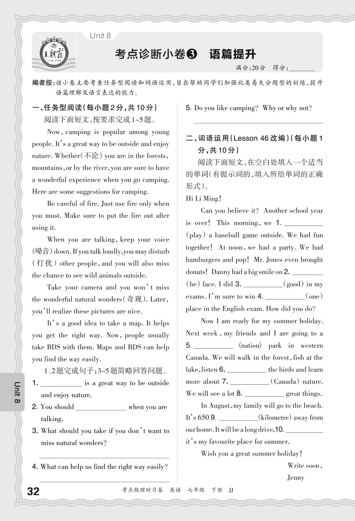 2024春下册七年级英语冀教版 Unit 8 考点诊断小卷3 语篇提升