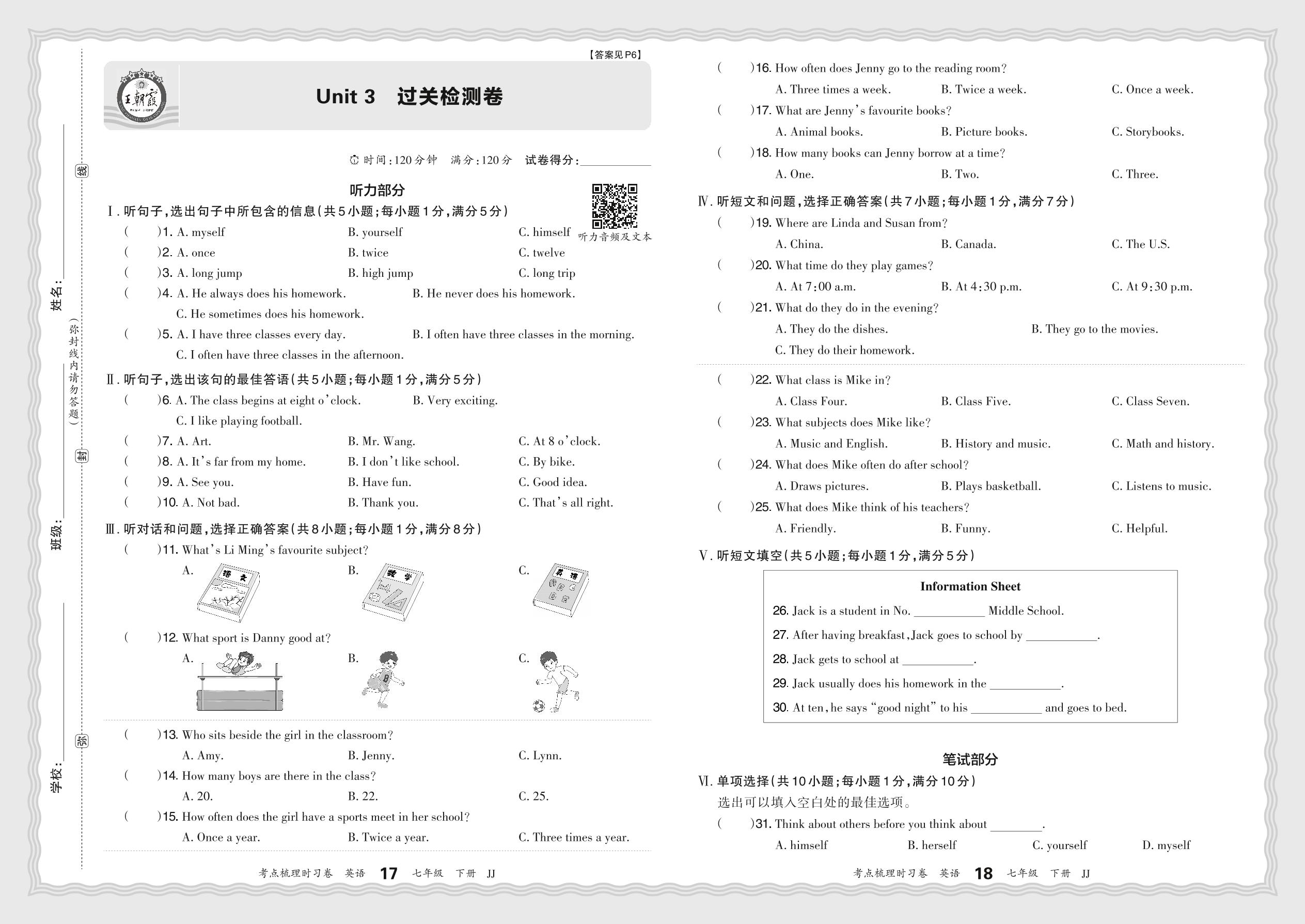 2024春下册七年级英语冀教版 Unit 3 过关检测卷