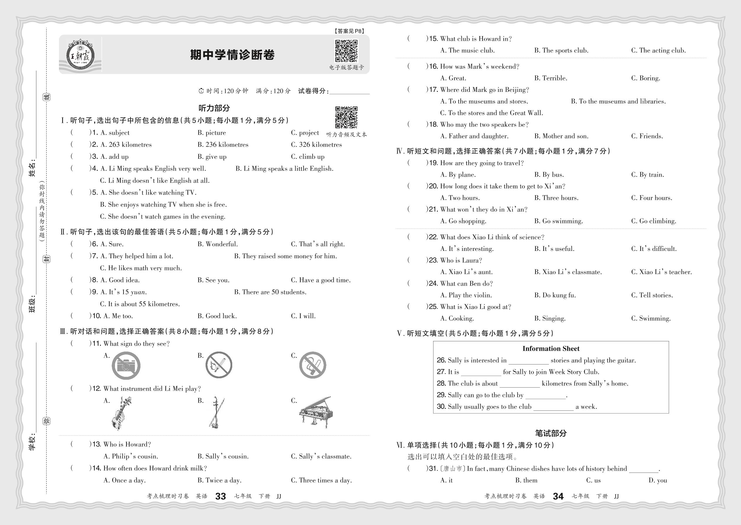 2024春下册七年级英语冀教版 期中学情诊断卷