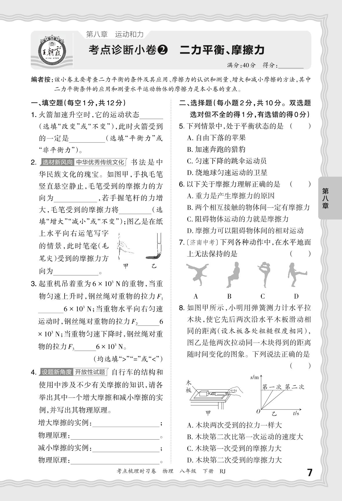 2024春下册八年级物理人教版 第八章 考点诊断小卷2 二力平衡、摩擦力