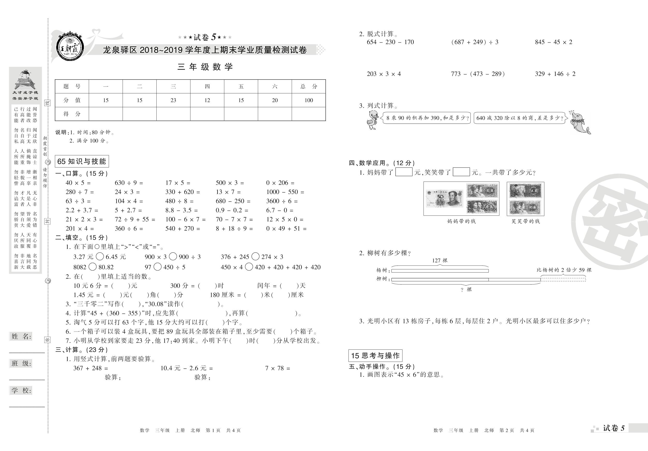 2018-2019学年第一学期成都市龙泉驿区三年级数学试卷(北师版)【5】