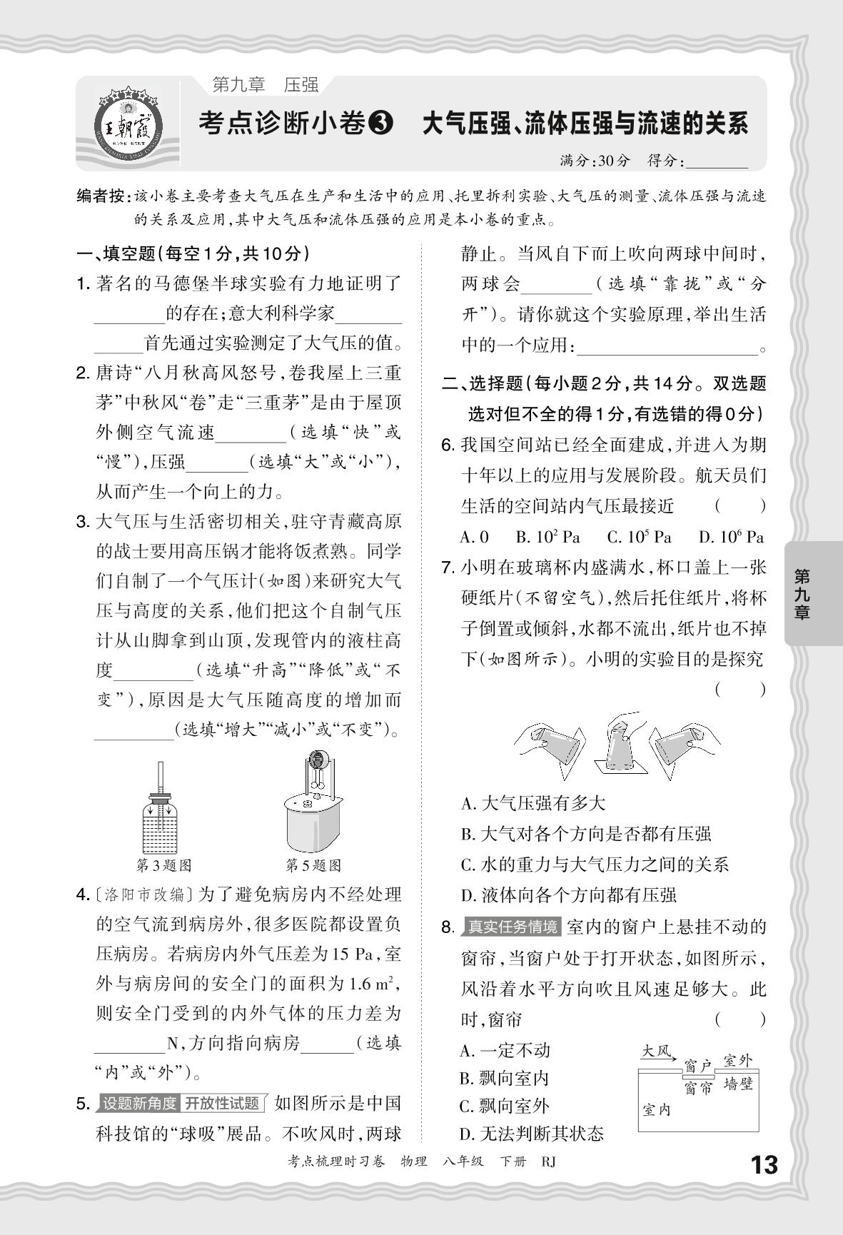 2024春下册八年级物理人教版 第九章 考点诊断小卷3 大气压强、流体压强与流速的关系