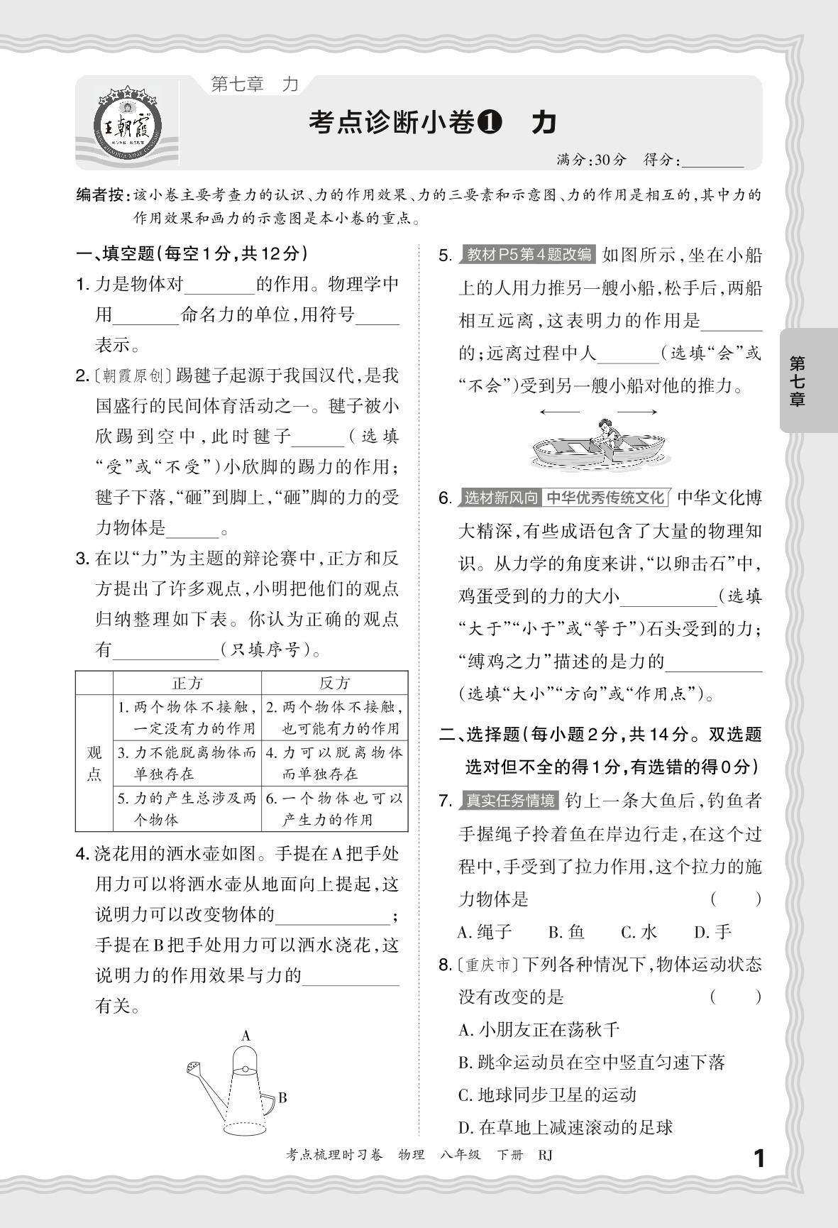 2024春下册八年级物理人教版 第七章 考点诊断小卷1 力
