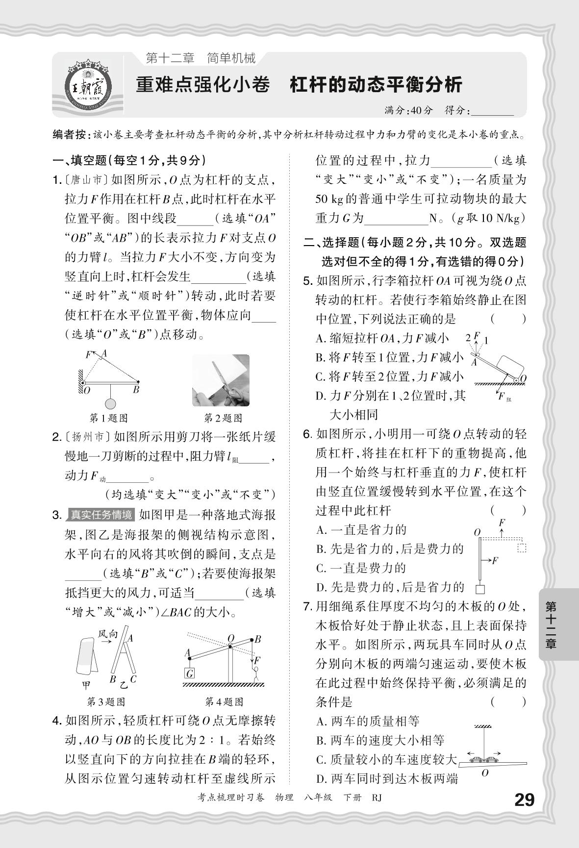 2024春下册八年级物理人教版 第十二章 重难点强化小卷 杠杆的动态平衡分析