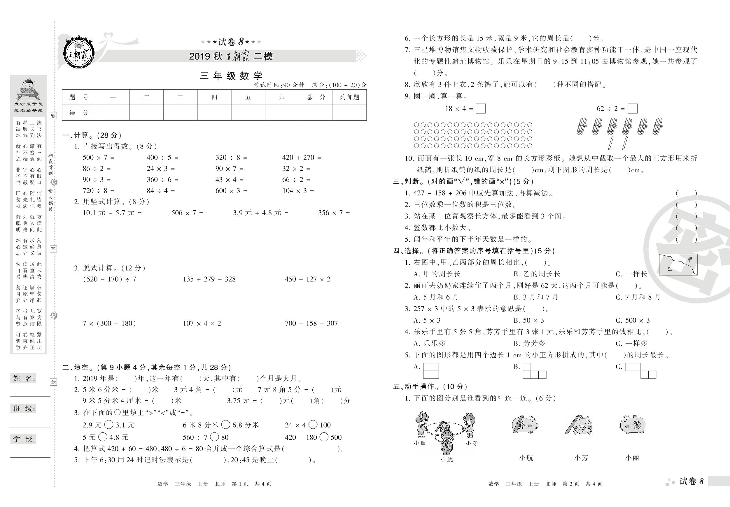 王朝霞期末模拟卷三年级上册数学(北师版)_R21080494807【8】