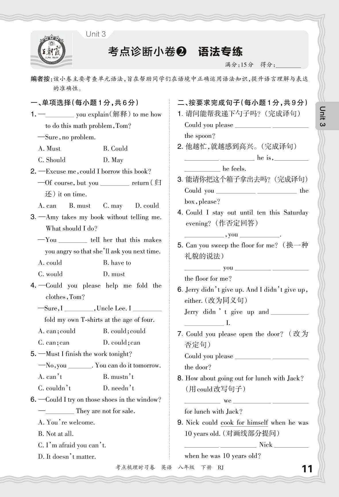 2024春下册八年级英语人教版 Unit 3 考点诊断小卷2 语法专练_R240117170245961