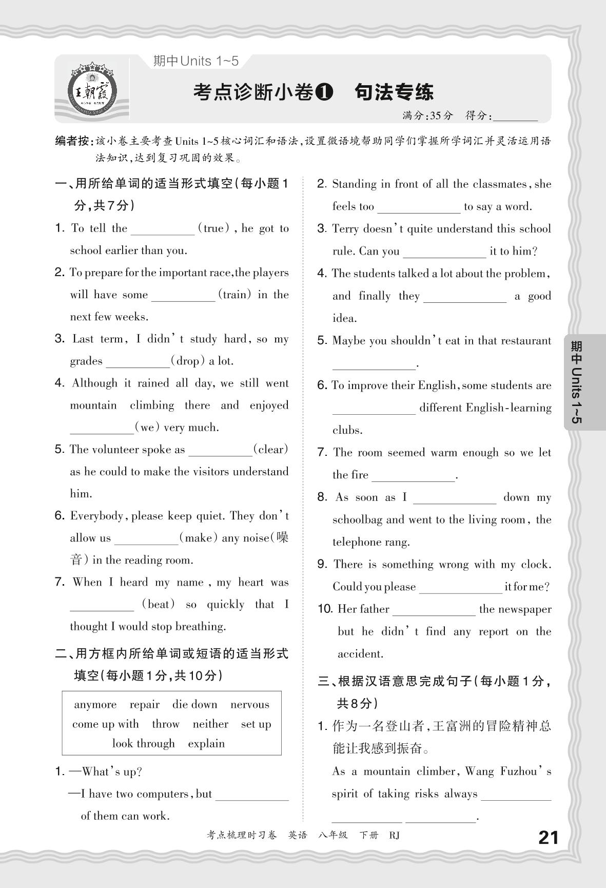 2024春下册八年级英语人教版 期中Units 1~5 考点诊断小卷1 句法专练