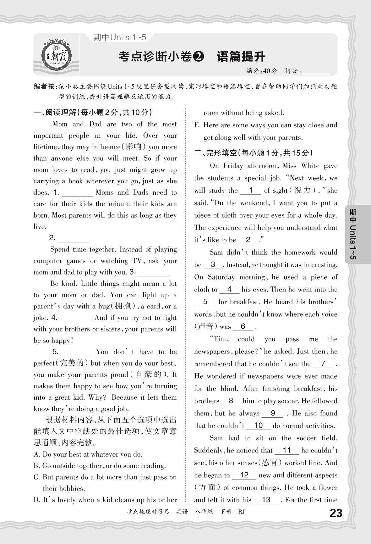2024春下册八年级英语人教版 期中Units 1~5 考点诊断小卷2 语篇提升