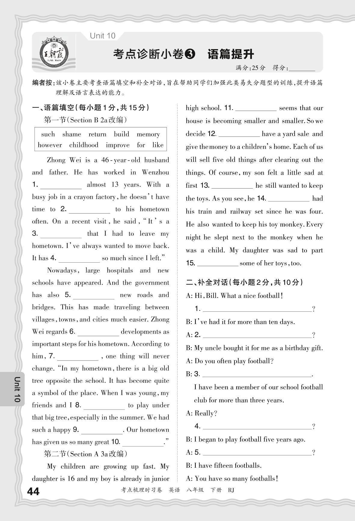 2024春下册八年级英语人教版 Unit 10 考点诊断小卷3 语篇提升_R240117170254187