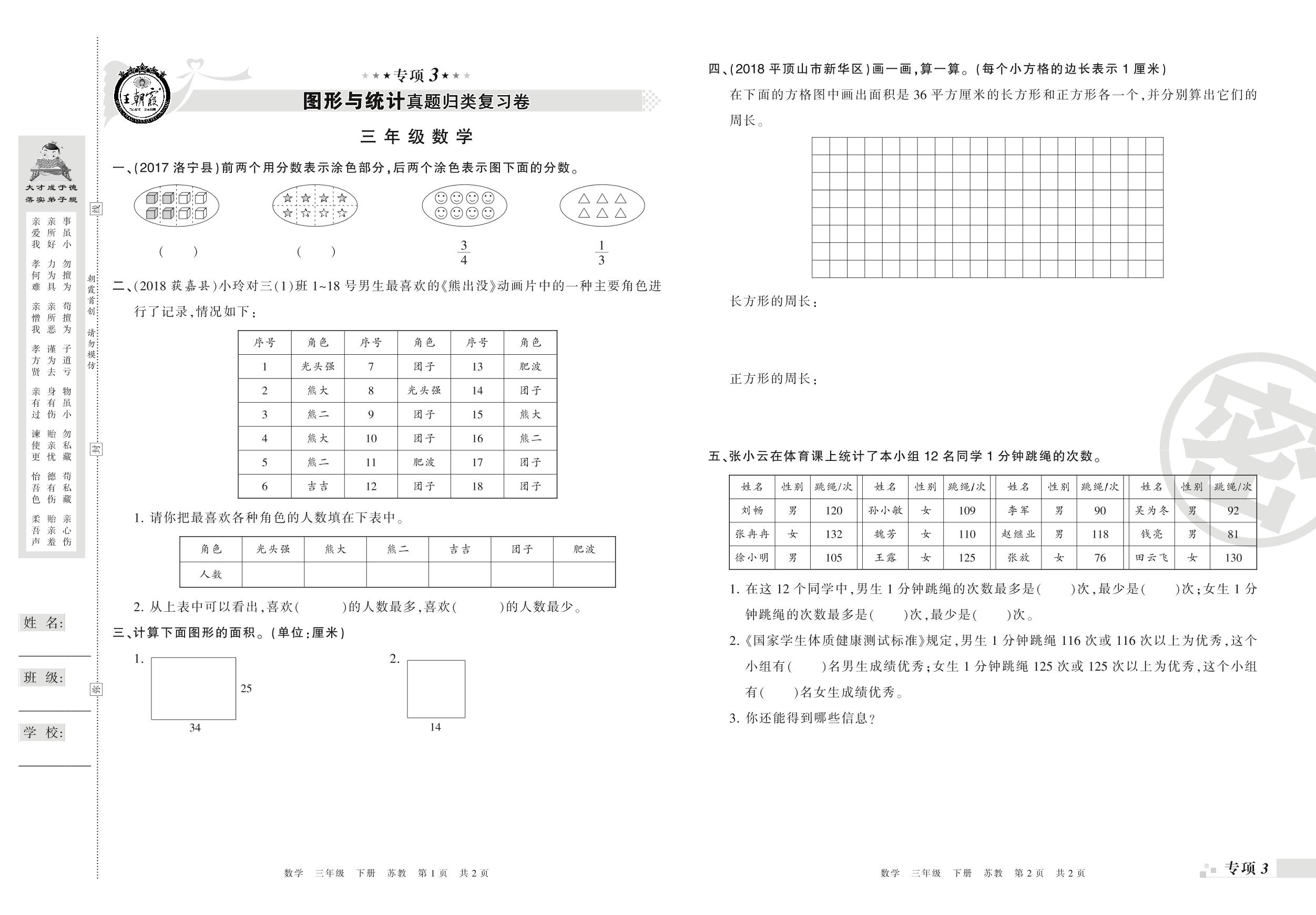 王朝霞期末专项卷——图形与统计、解决问题真题归类复习卷三年级下册数学(苏教版)_R21080494829【0】